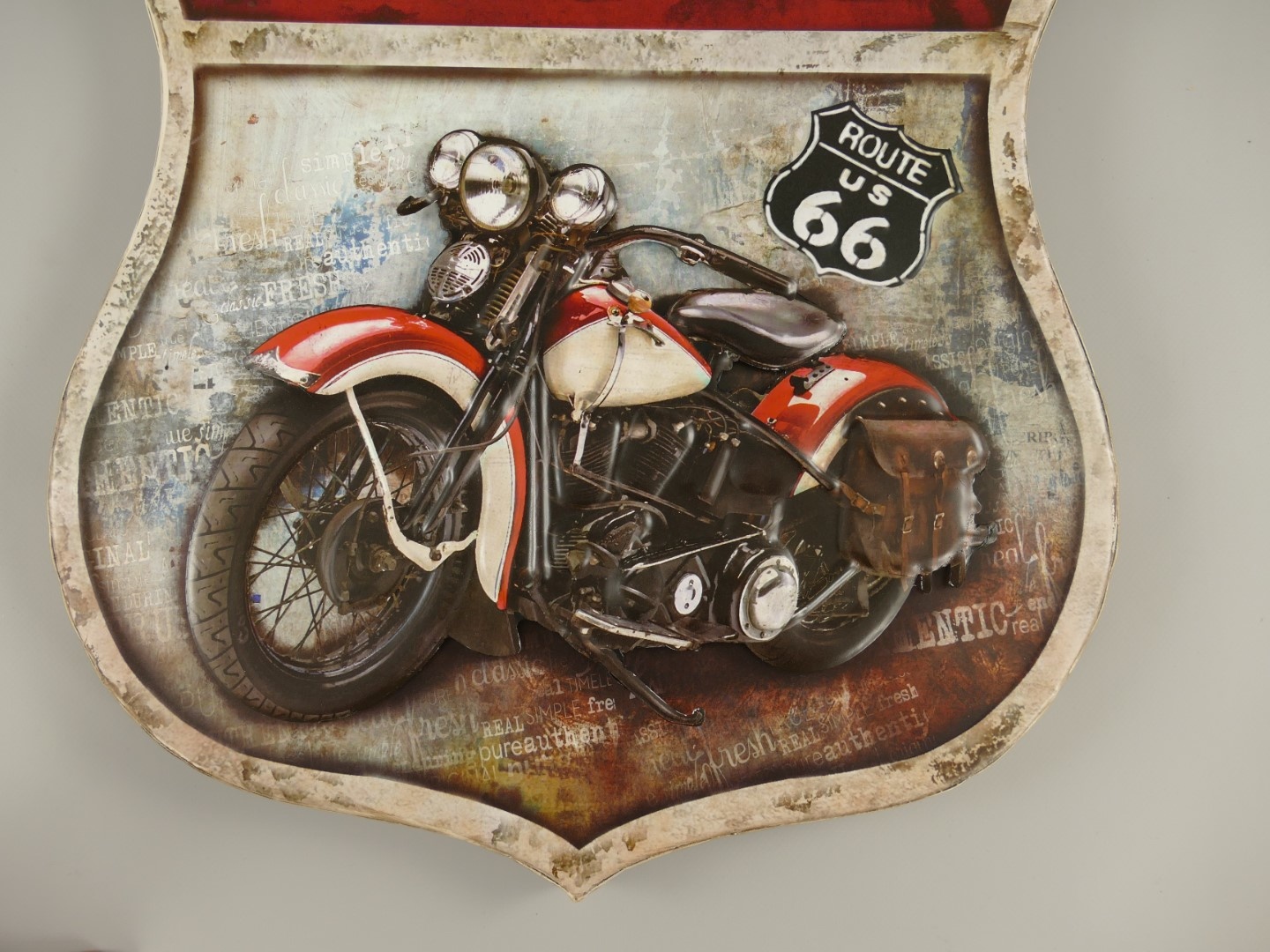 Diese Wanddekoration besteht aus Stahlblech mit einer gespritzten Oberfläche, die mit einem Transfer überzogen ist und oft einen gewellten Rand aufweist.