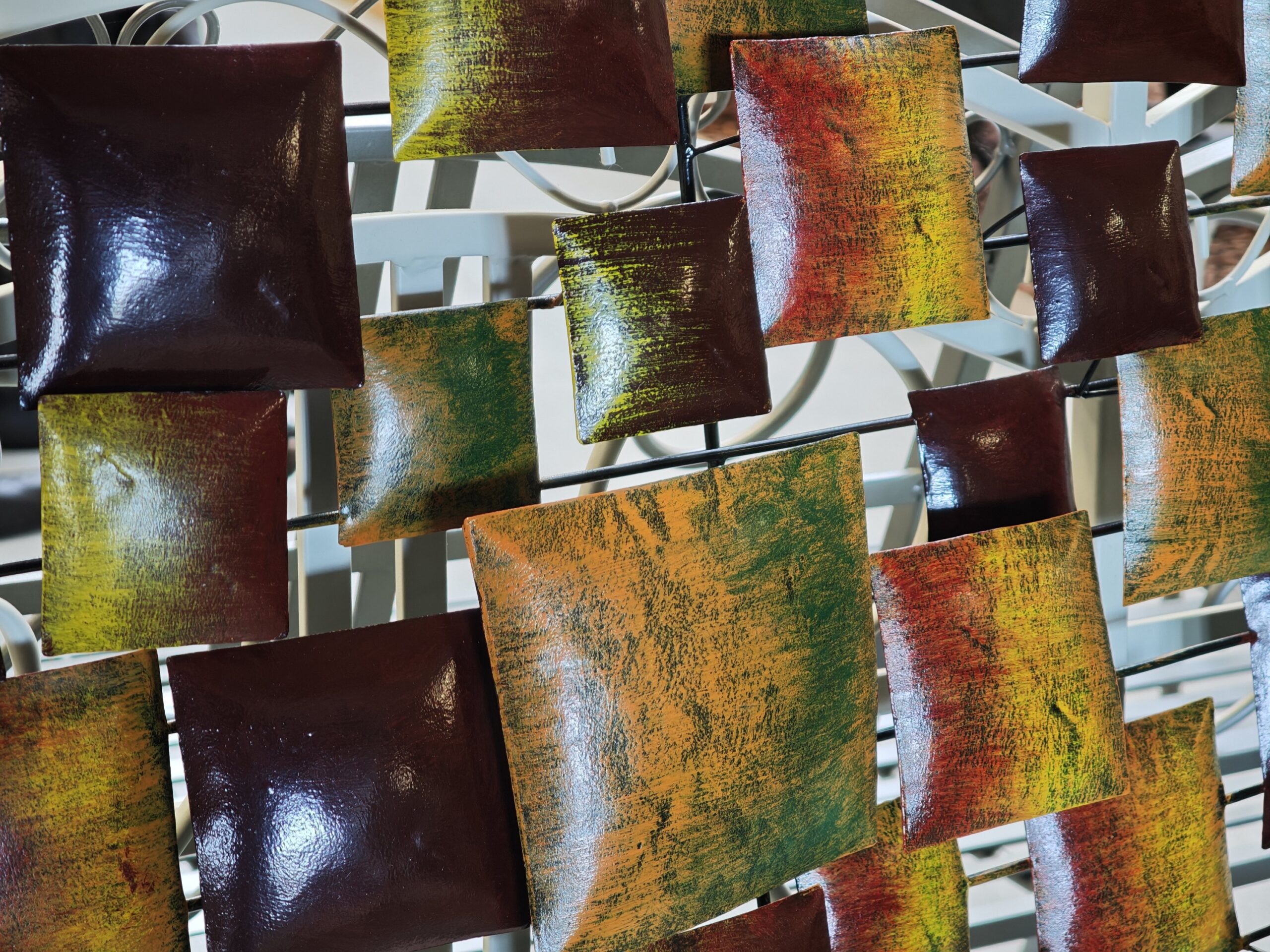 Diese stimmungsvolle 70x70cm große Wanddekoration aus Metall besteht aus einer Komposition von quadratischen Blöcken in warmen Herbstfarben wie Rot, Orange, Gelb und Grün. Die Würfel sind in unterschiedlichen Tiefen auf dem Rahmen platziert, wodurch ein lebendiger 3D-Effekt und ein spielerischer Schatteneffekt an der Wand entsteht. Ein kompaktes und künstlerisches Kunstwerk, das jedem Raum in Ihrem Zuhause Wärme und Farbe verleiht.