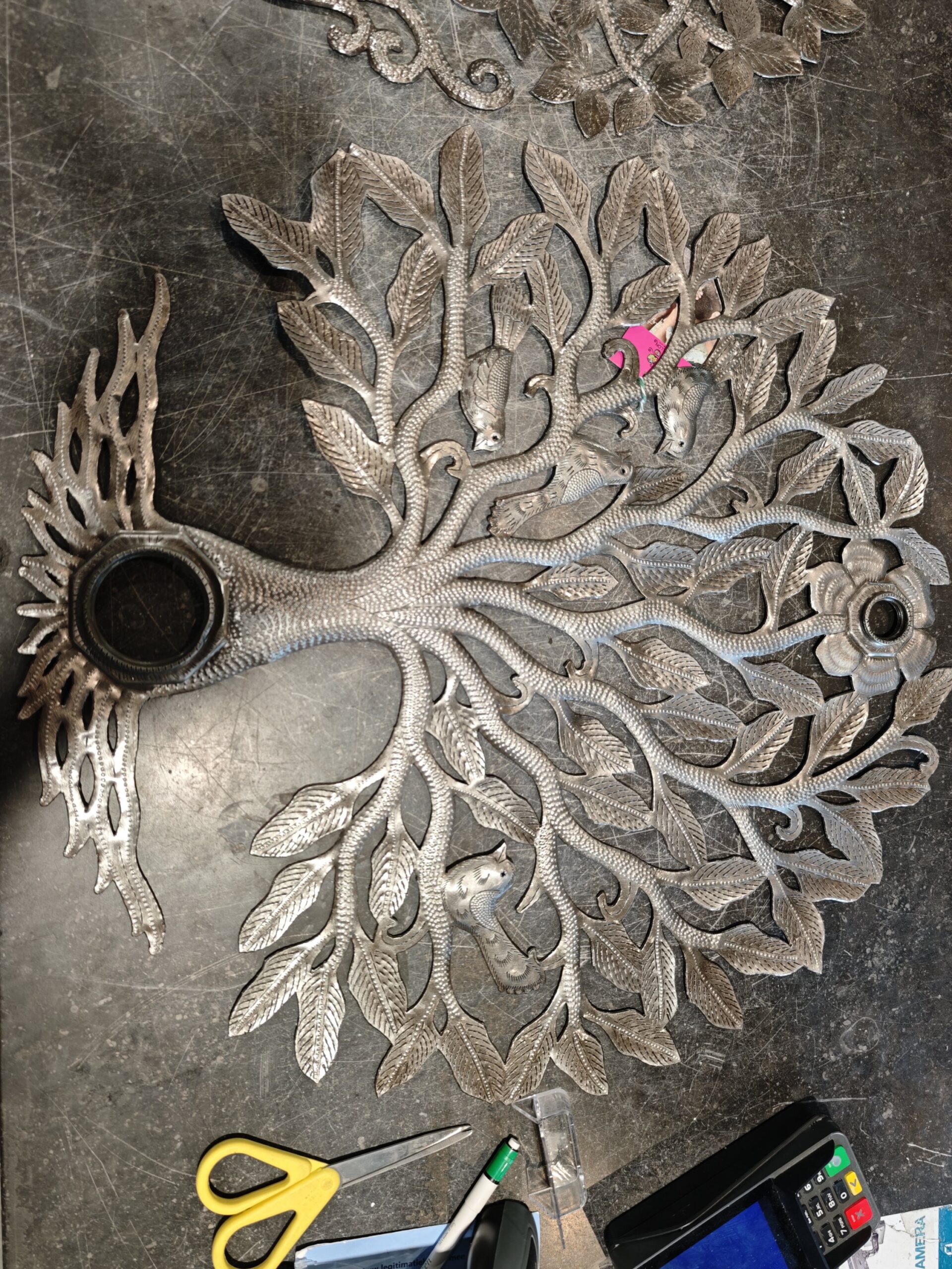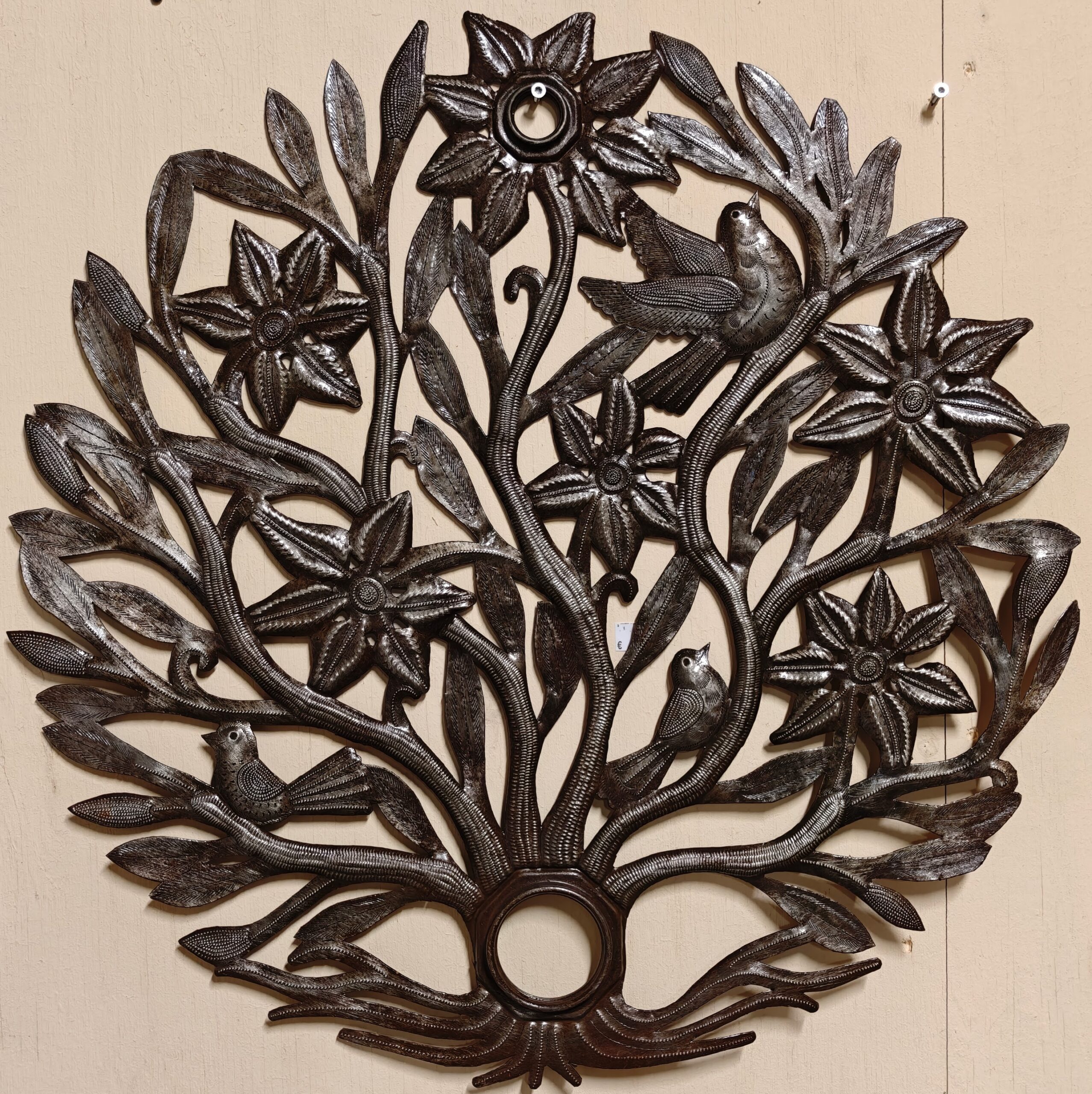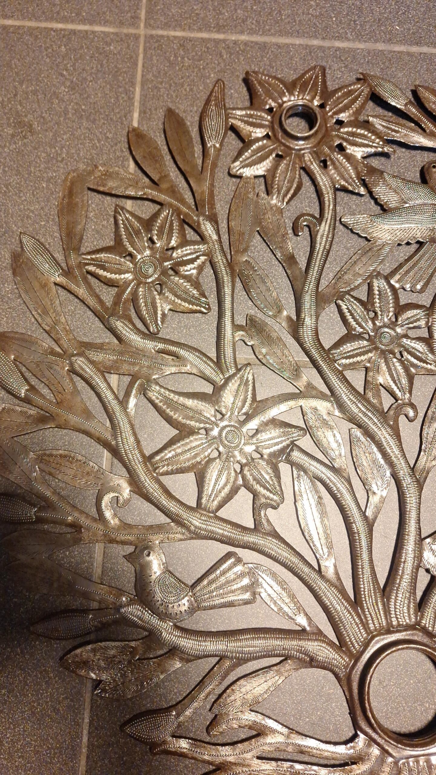 Dieses Stück Wanddekoration ist eine Augenweide. Dieses Wanddekomodell wird in Haiti von den so genannten Bosmetal-Arbeitern aus dem Deckel eines Ölfasses hergestellt, an dem sie tagelang arbeiten, um dieses Produkt herzustellen. Schneiden, Ausbeulen oder Abflachen mit dem Hammer, Arbeiten mit Dübeln und Streichen. Wenn man sich den Artikel genau ansieht, ist man erstaunt, wie viel Arbeit darin stecken muss. Wenn Sie diesen Artikel bestellen, unterstützen Sie die Weltladen-Organisation Our Market und helfen diesen Menschen im armen Haiti.