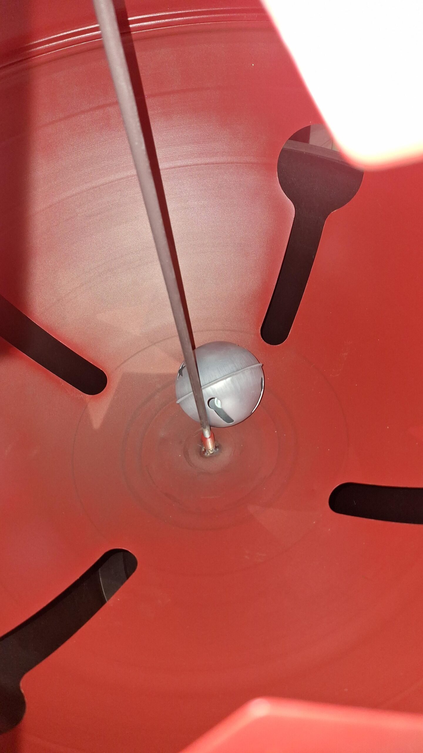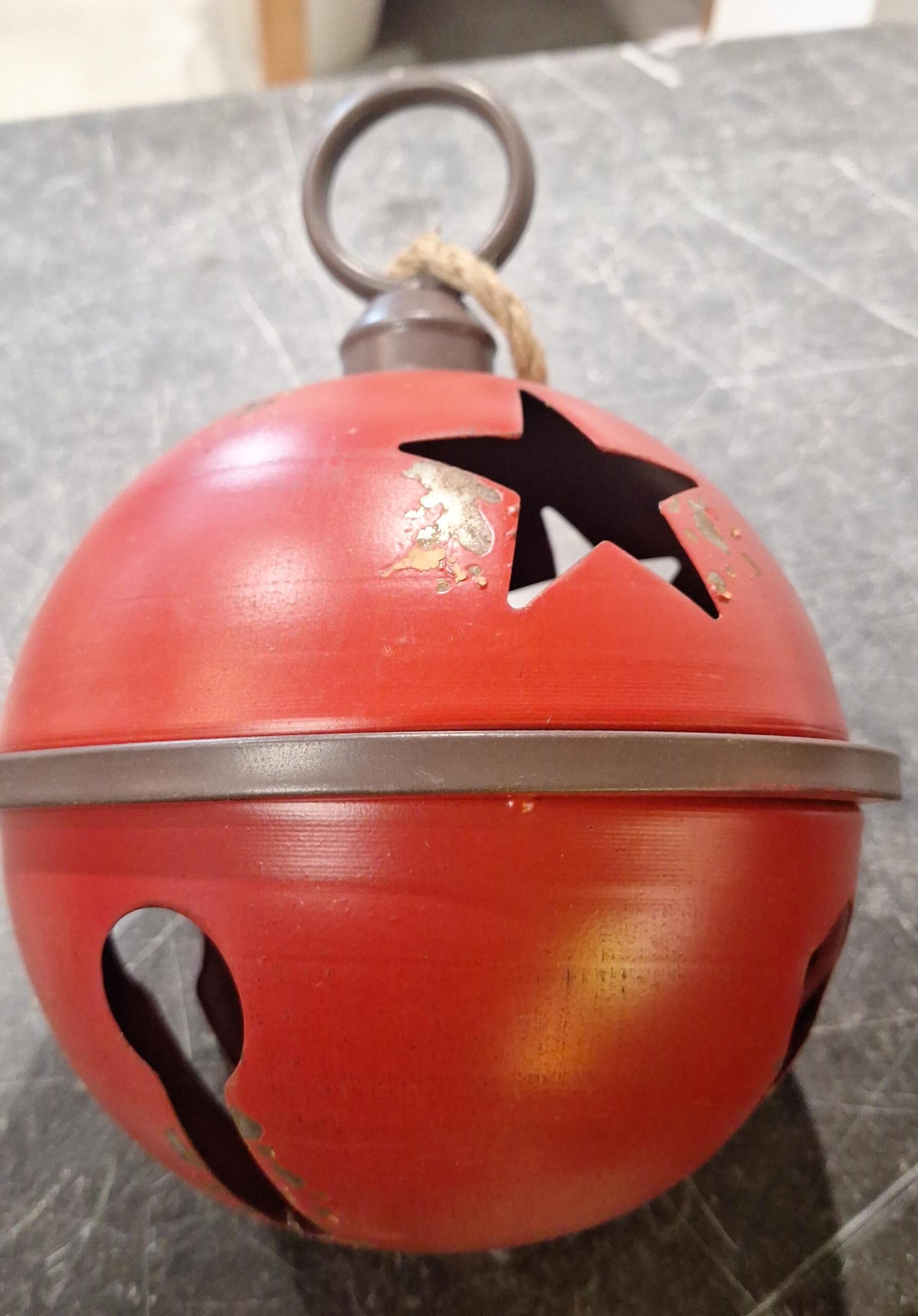 Wunderschöne handgefertigte rote Metallkugel mit einer Glocke im Inneren.