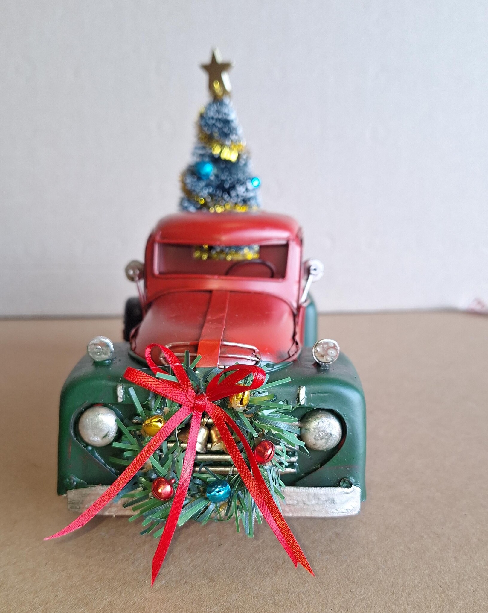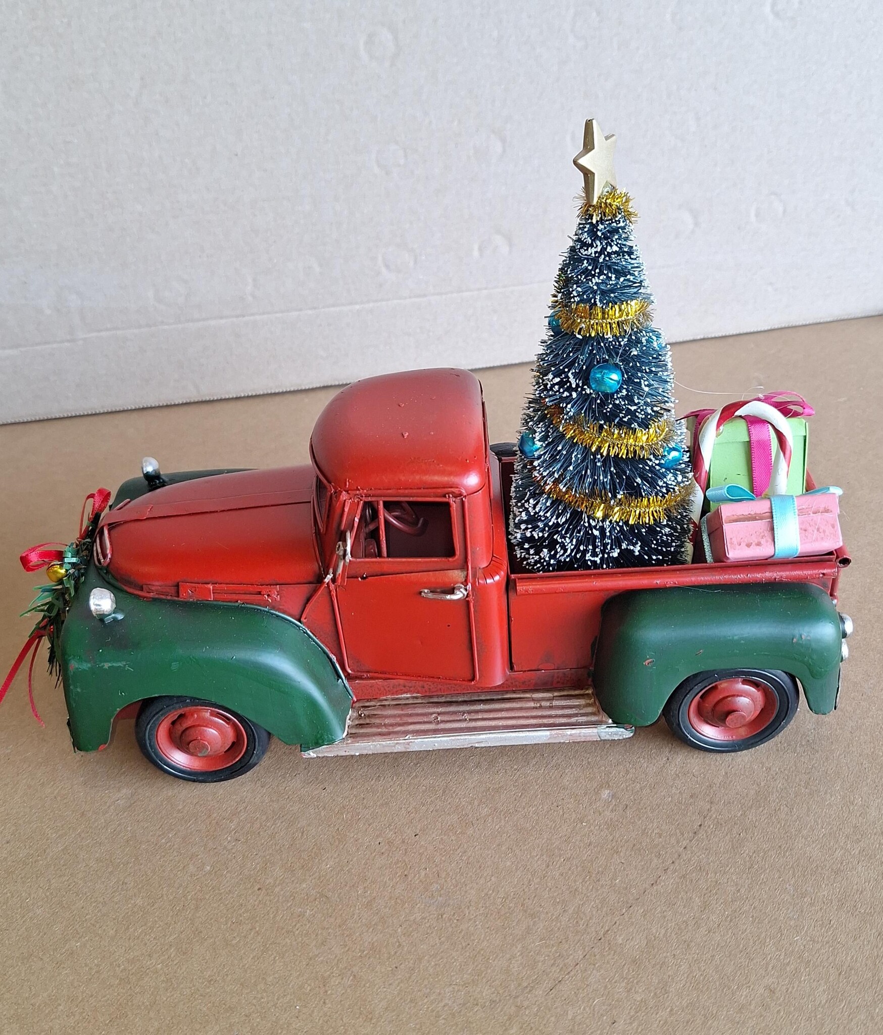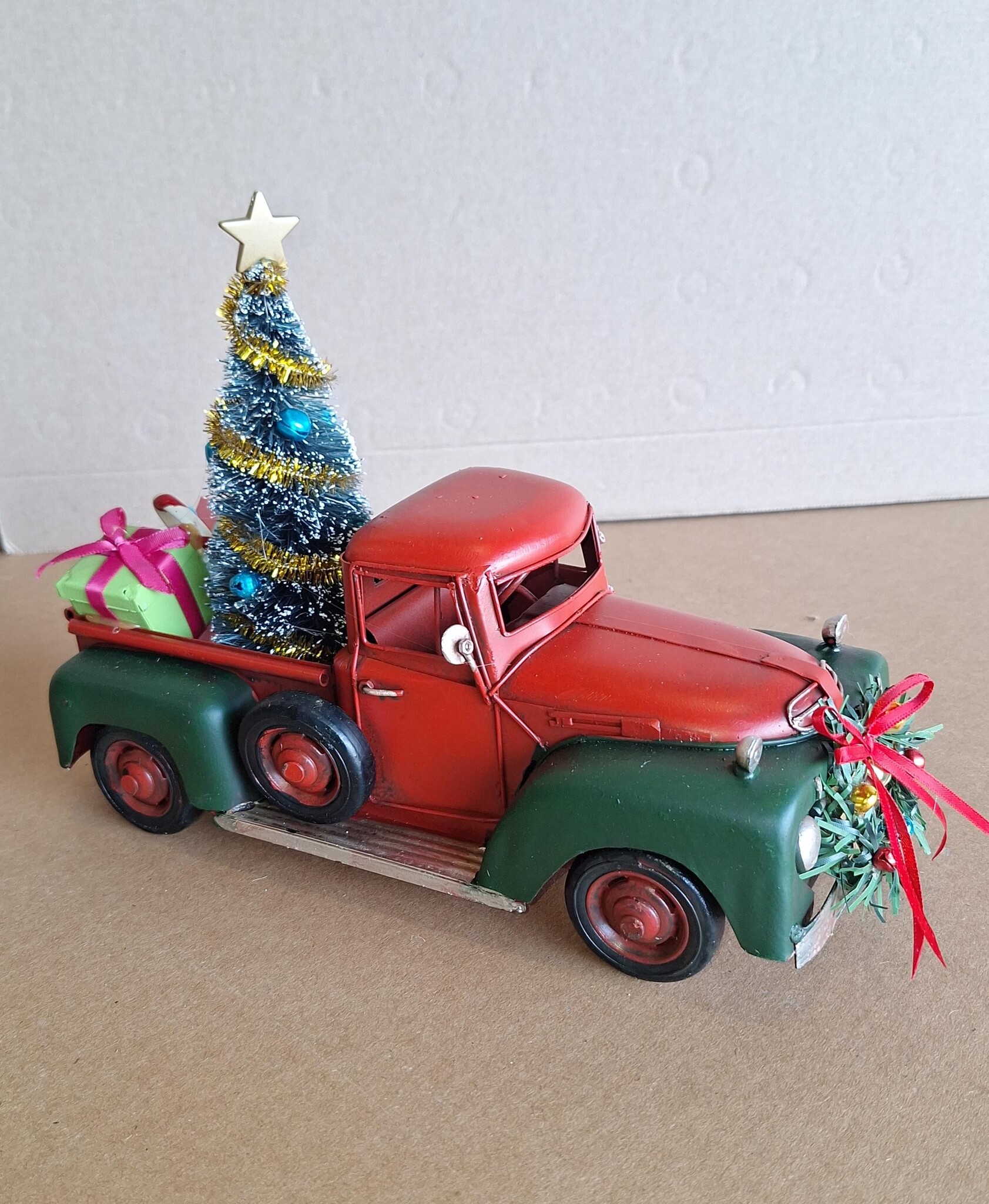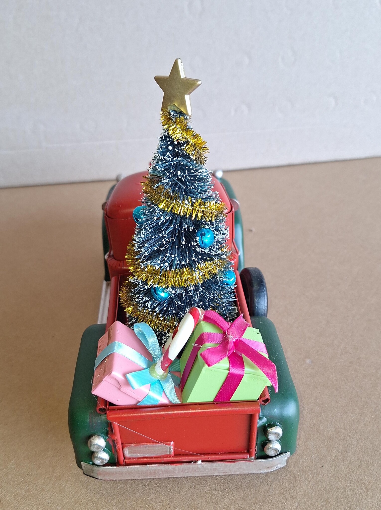 Schönes handgefertigtes Modell eines mit Weihnachtsgeschenken beladenen roten Lastwagens.