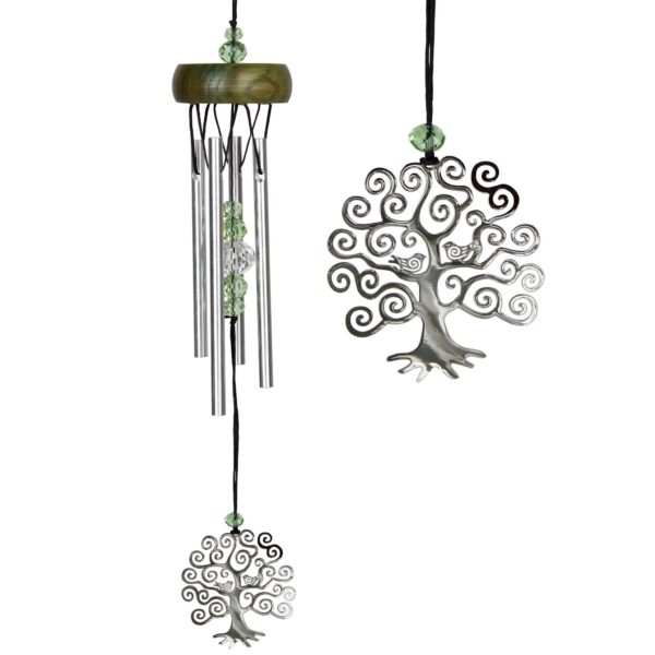 Dieses Modell mit silbernen und grünen Farben und einem schönen Lebensbaummotiv ist eine wunderbare Ergänzung für Ihren Garten, wenn Sie ein Windspiel mit natürlichem oder religiösem Charakter suchen. Die Stangen sind aus Aluminium gefertigt.