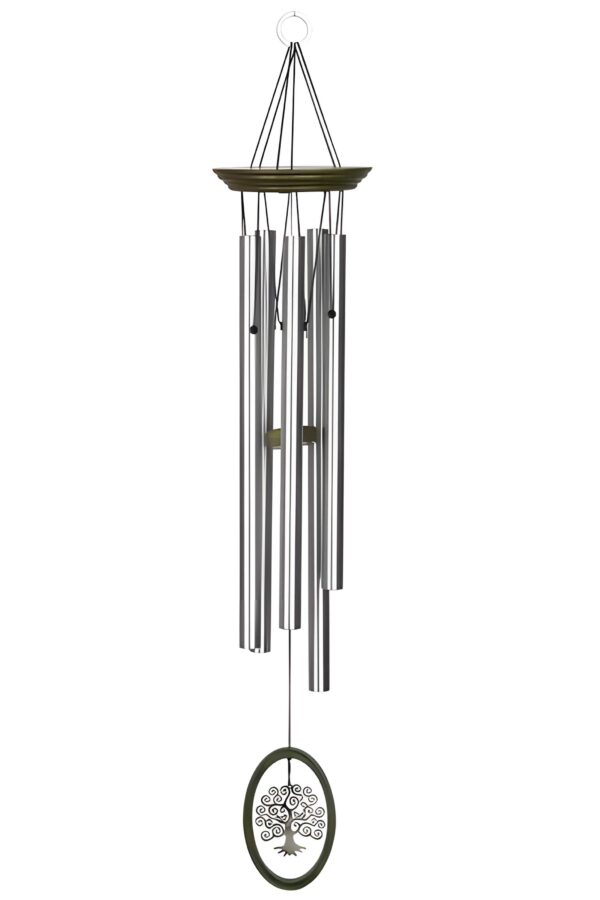 Dieses Modell mit grünen und silbernen Farben und einem schönen Lebensbaummotiv ist eine wunderbare Ergänzung für Ihren Garten, wenn Sie ein Windspiel mit natürlichem, religiösem Charakter suchen. Die Stangen sind aus Aluminium gefertigt.