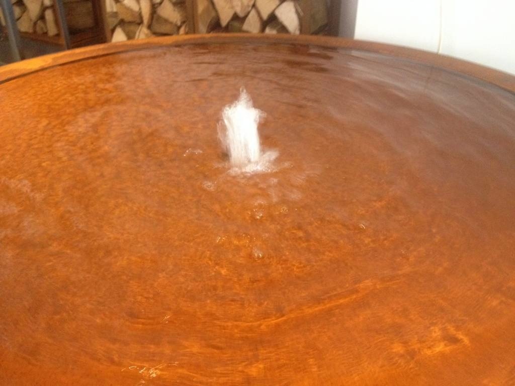 Very nice handcrafted and solidly finished water table made of 3mm thick corten steel. On the top, the water forms a 2cm thick layer of water, which subtly flows off the edges. Pebbles can also be sprinkled on the platform if desired.
