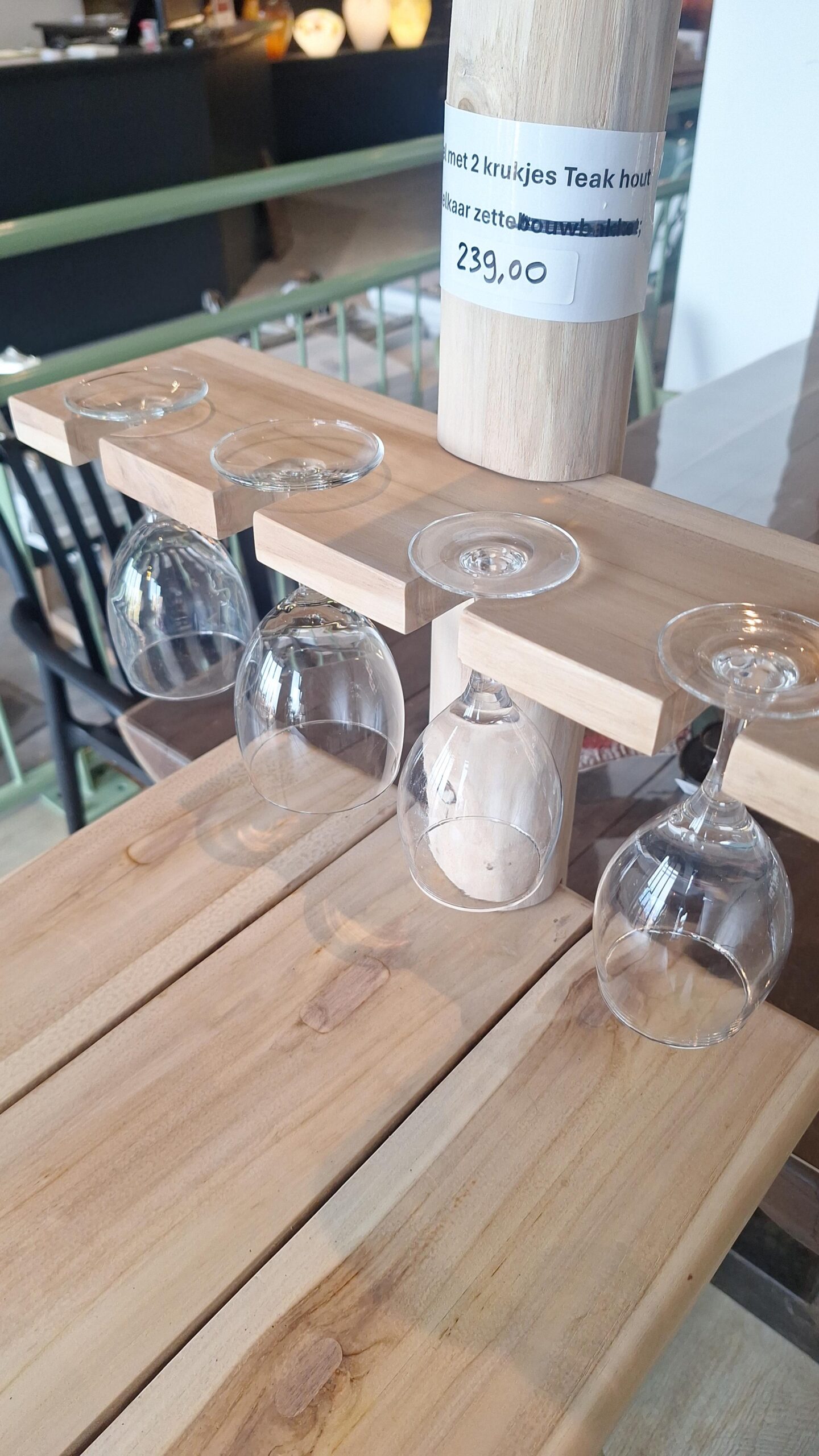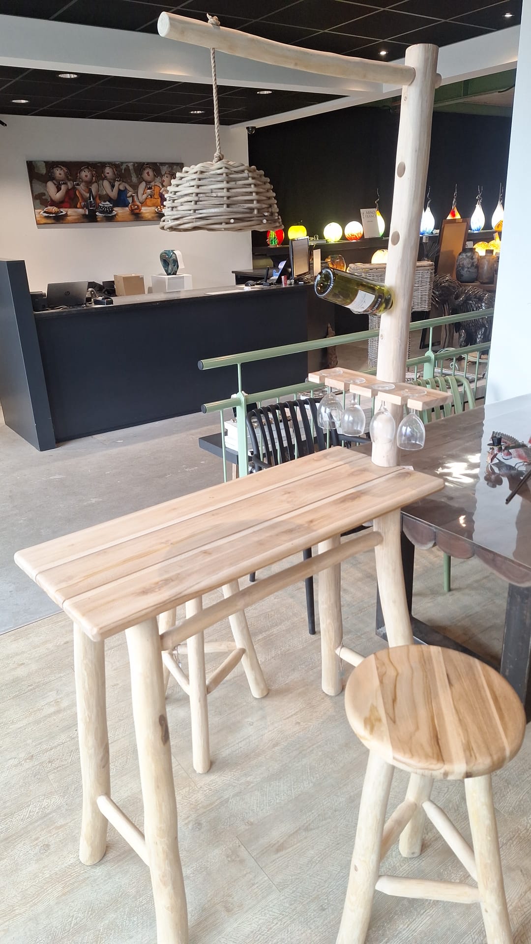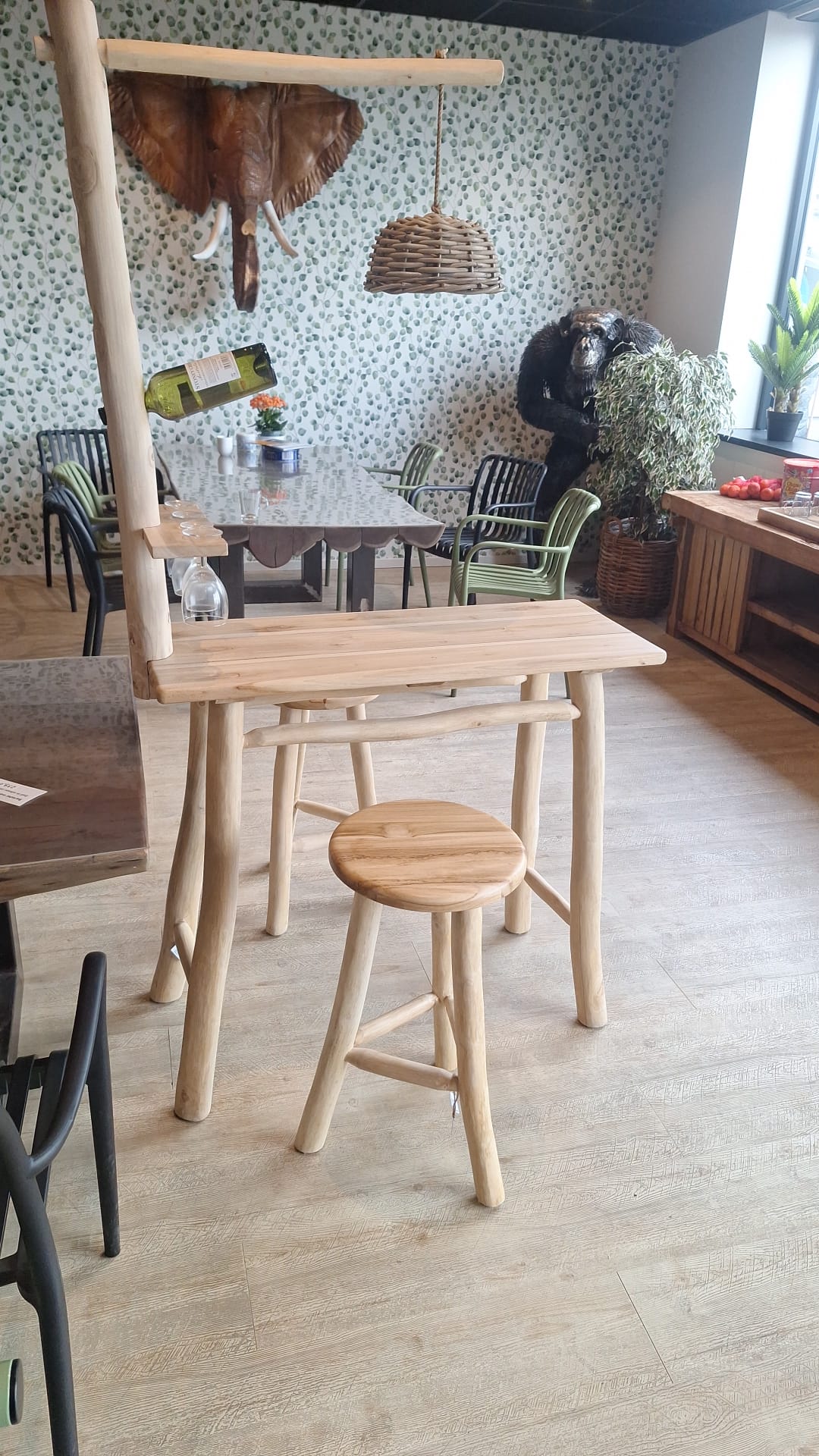 If you are looking for an attractive and functional addition for the garden or a cozy mancave, this complete teak bar set is a fantastic choice. With an impressive total height of 190 centimeters, this piece of furniture offers a full bar experience in your own familiar surroundings. The set is made of high-quality teak wood. Keep in mind that with outdoor use, the wood will naturally age beautifully and work slightly, which actually adds to its authentic, rustic look. The bar table has a practical and accessible size of 100 centimeters wide, 40 centimeters deep and 92 centimeters high. The matching stools have a diameter of 35 centimeters and a comfortable seat height of 65 centimeters. What makes this bar set extra unique are its beautiful and clever details: the furniture features a handy rack for glasses and a holder for three bottles. At the top, there is also a decorative lampshade. Although it is designed purely for decoration, you can easily place a nice battery-operated lamp in here for extra ambiance during the late hours. Let’s make it cozy! In addition to decoration, we also have a special selection of furniture. You are welcome to come to our showroom to experience this bar set and our further range for yourself.
