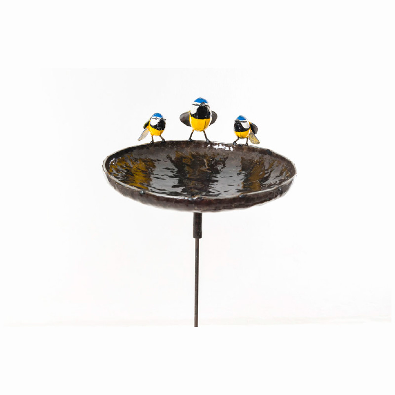 This metal bird drink bowl on 100 cm pin is a vibrant addition to your garden. The dark, rustic bowl is brightened by three hand-painted great tits in yellow, white and blue sitting cozily together on the rim. A versatile and attractive decorative piece that can be used as both a feeding spot and a water bath.