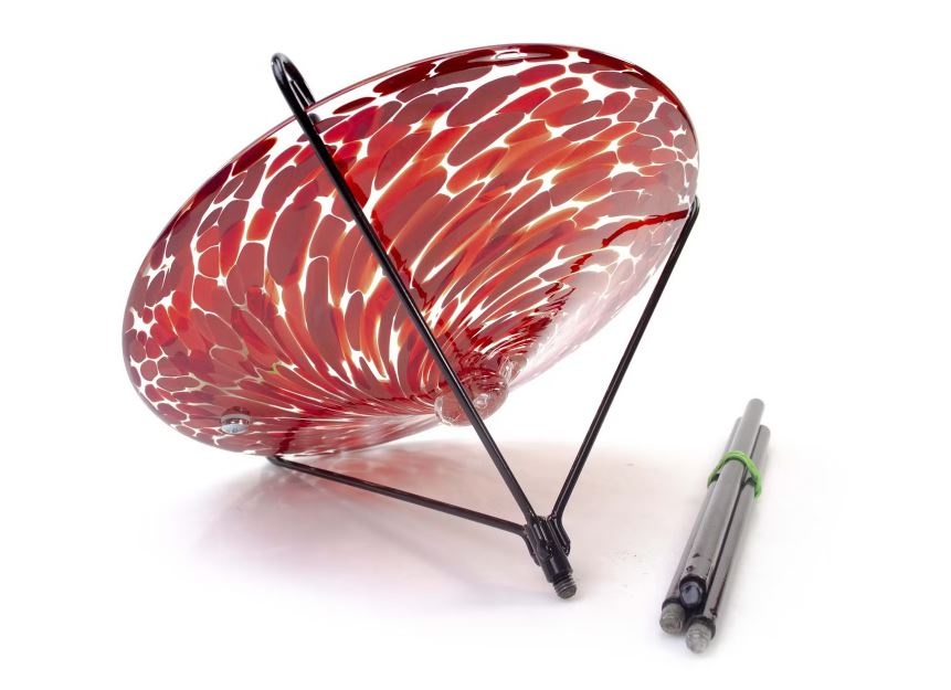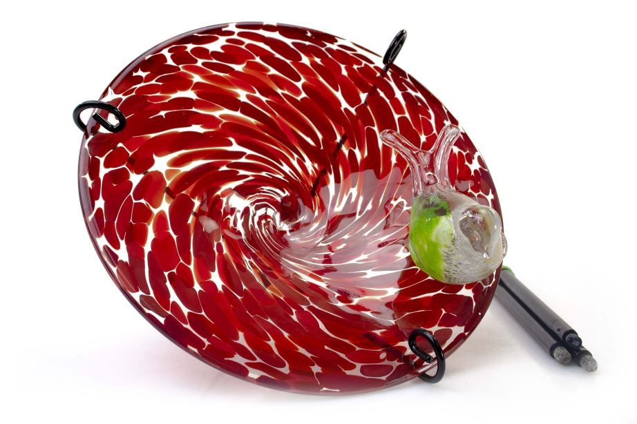 Unique glass object of a bird drinking bowl on a pin with a height of 90cm.