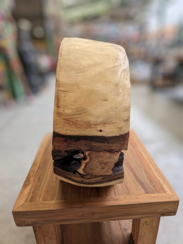 Suar wood has the property of having contrasting colors in it. Light-colored wood can be right next to dark-colored wood. It is normal for these color differences to be visible in this piece as well. This unfortunately cannot be claimed.