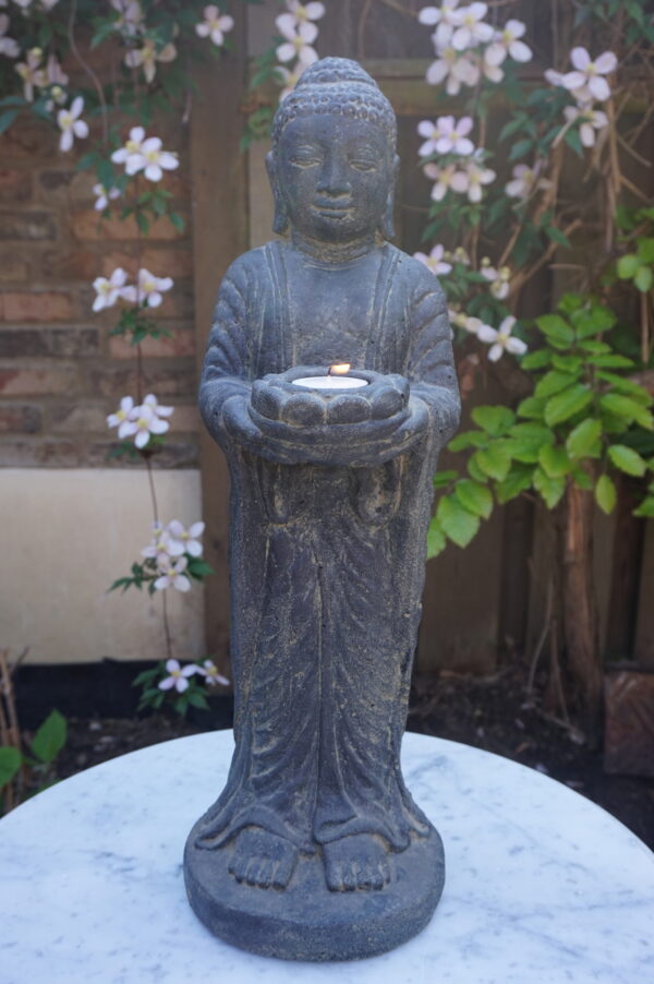 Statues from this series are all made of high quality cast stone with a very high cement content, so all these statues can withstand all weather conditions with ease. The color is black/brown and may always vary slightly from the photo because all of this series is handmade. This standing buddha is 16x18x50cm high.