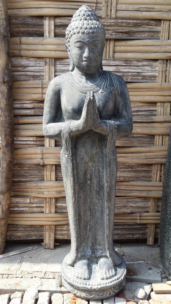 Beautiful mood-enhancing greeting Buddha in 4 sizes; from 50, 80cm, 25x100cm, 37x120cm, 40x120cm and 50x190cm high.Standing Buddha figure with the “Asian” way of greeting, by folding both hands towards each other. Buddhists even Hindus greet each other this way.