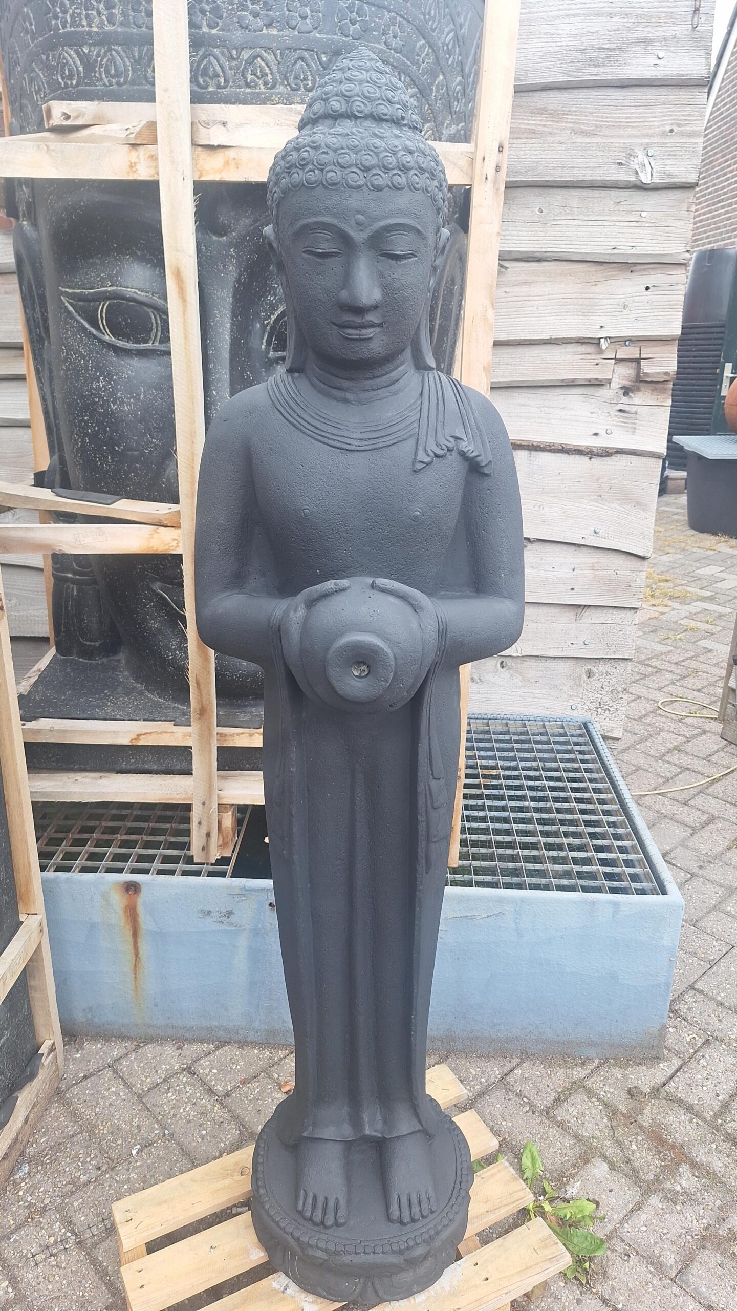 Standing water spouting buddha. Made of cast stone in black color.