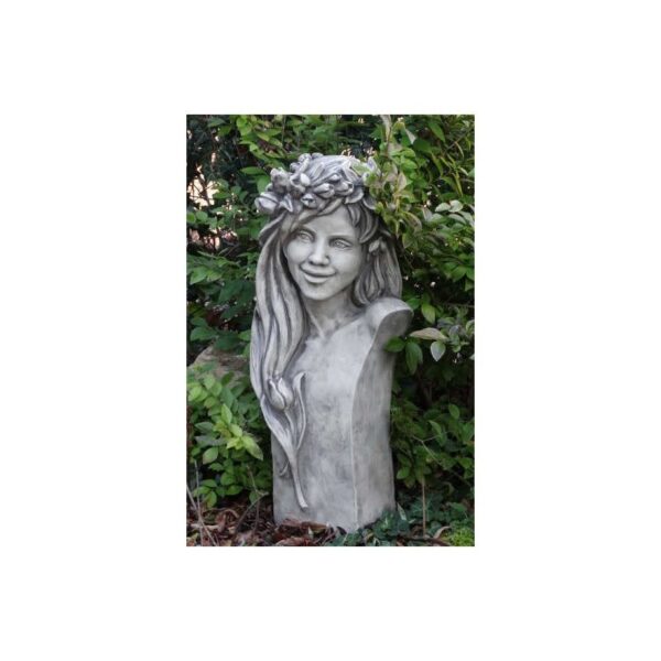 Superbly beautiful is this large face of a female Flower Girl, perfectly detailed, and grayish washed in. This statue is made of high-quality solid cast stone which ensures years of atmospheric enjoyment. Beautiful this sculpture in your garden, but certainly in larger homes, or in/near your business. Stands stably on sturdy floor plate. On pedestal 1148917, this sculpture will look even better.