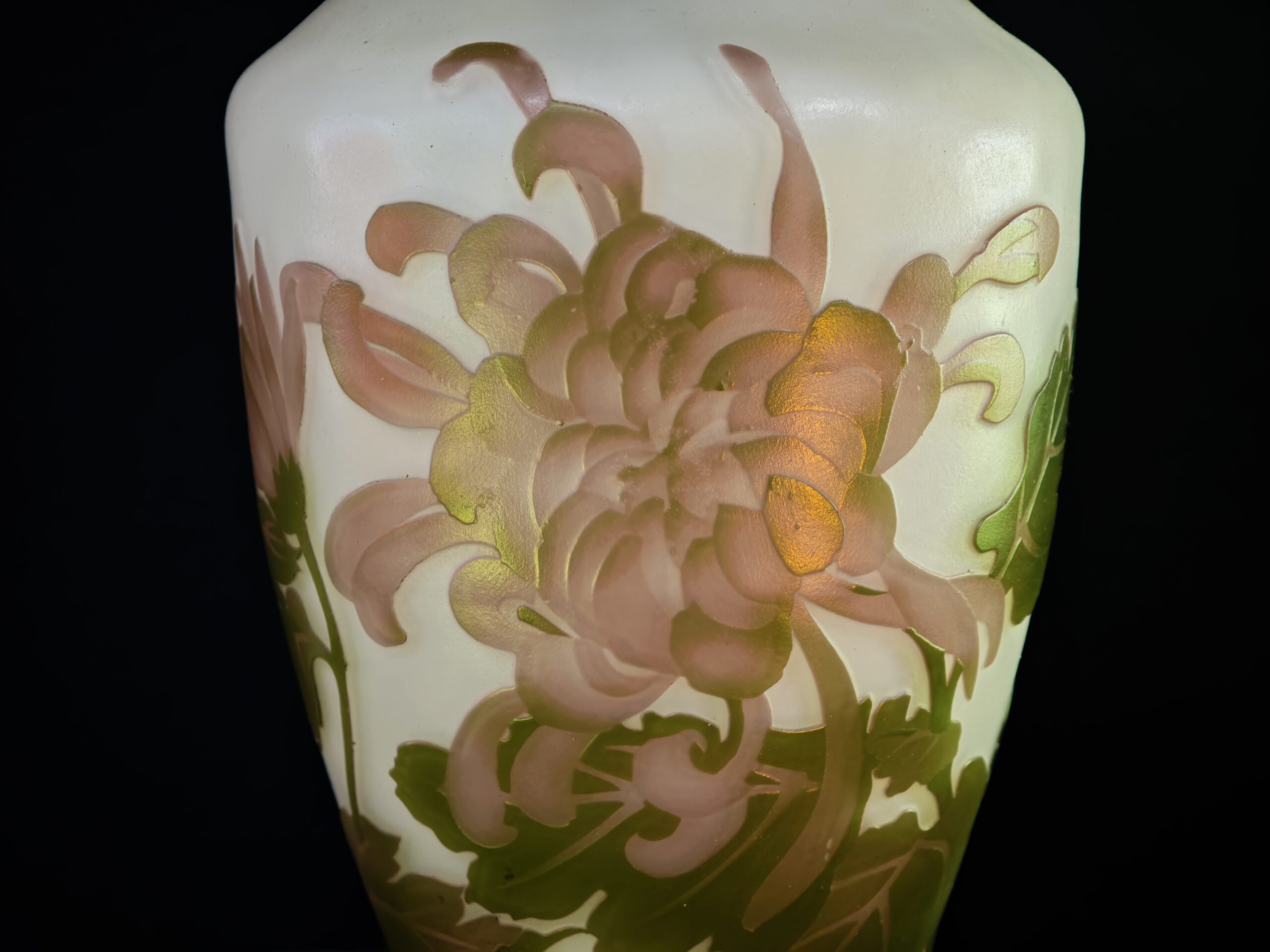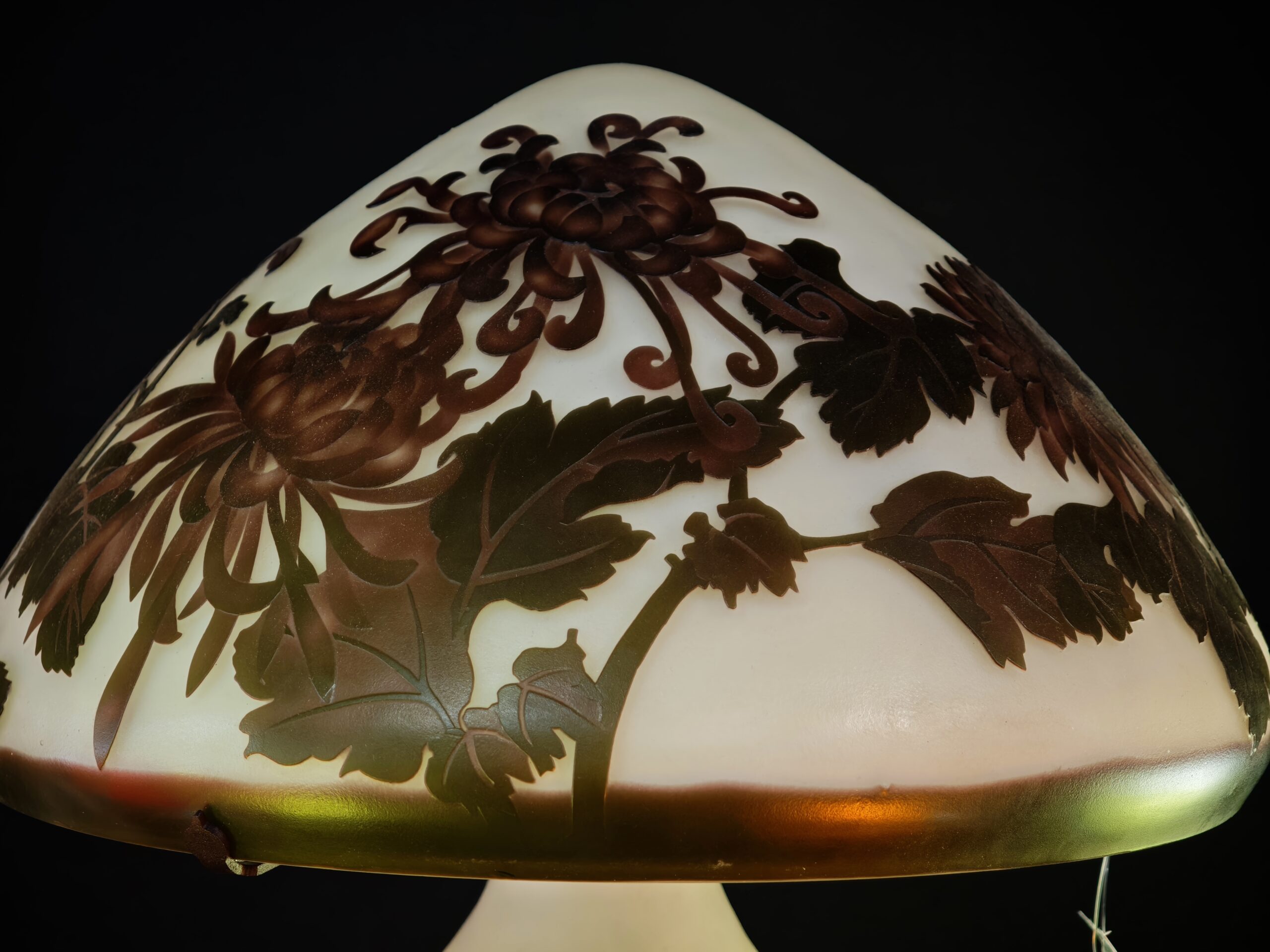 Beautiful brown/white/green colored large lamp with chrysanthemums made of glass in a graceful shape made according to the old Cameo technique, following the example of the world famous glass artist Émile Gallé.