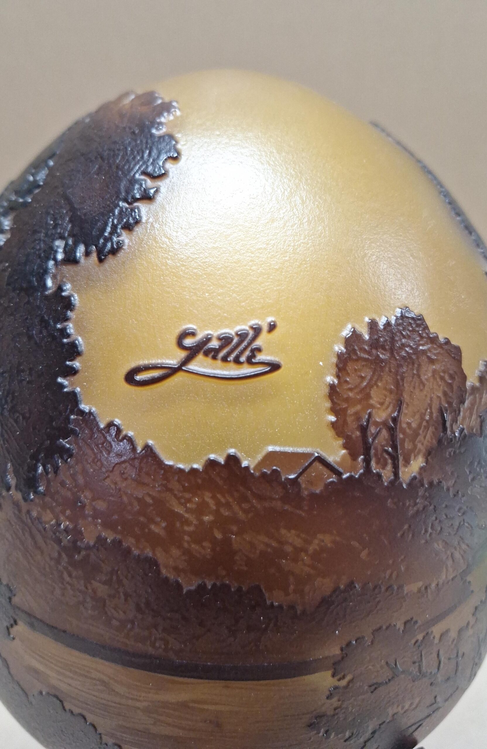 Beautiful yellow/brown colored lamp with a displayed forest of glass in a graceful shape made according to the old Cameo technique, following the example of the world famous glass artist Émile Gallé.