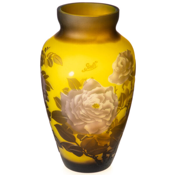 Beautiful half-height vase with brown roses made of glass in a slightly tapered shape made according to the old Cameo technique, following the example of the world famous glass artist Émile Gallé.