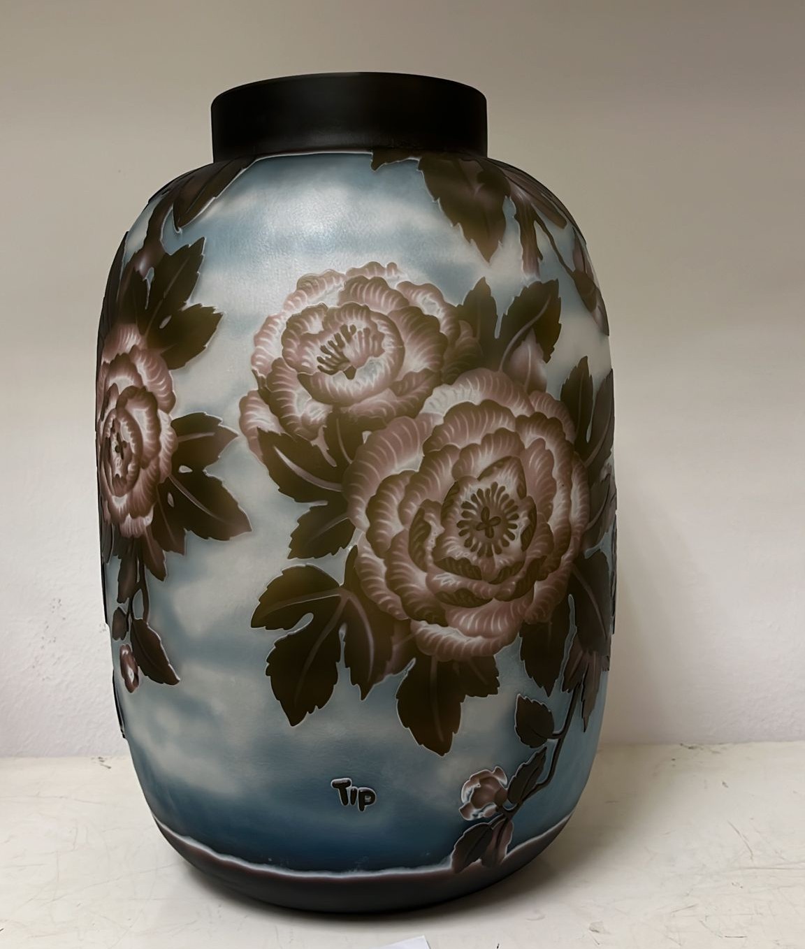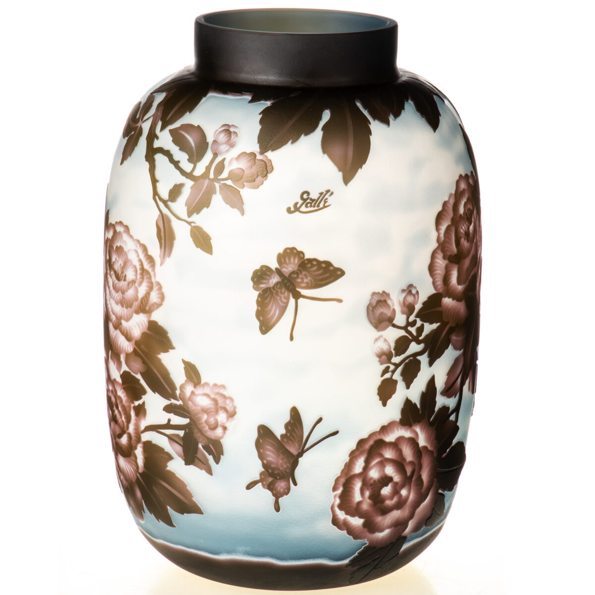 Beautiful tall glass vase with butterflies and roses in a convex shape with narrow neck made according to the old Cameo technique, following the example of the world famous glass artist Émile Gallé.