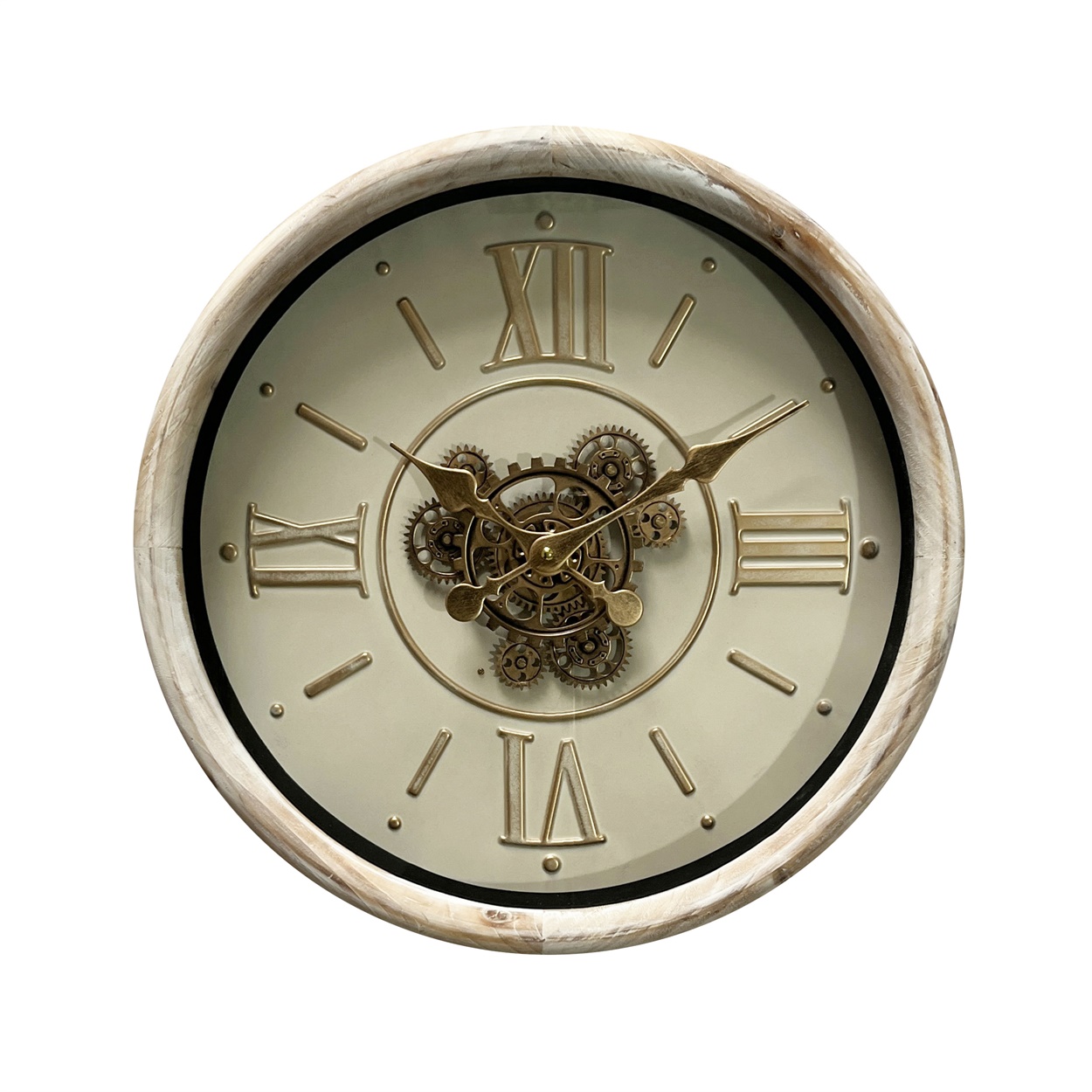 It will be a treat to see what time it is now, with this beautiful round cream colored wall clock with moving parts. This very nice clock has a wooden frame in a cream blended color, with roman numerals.