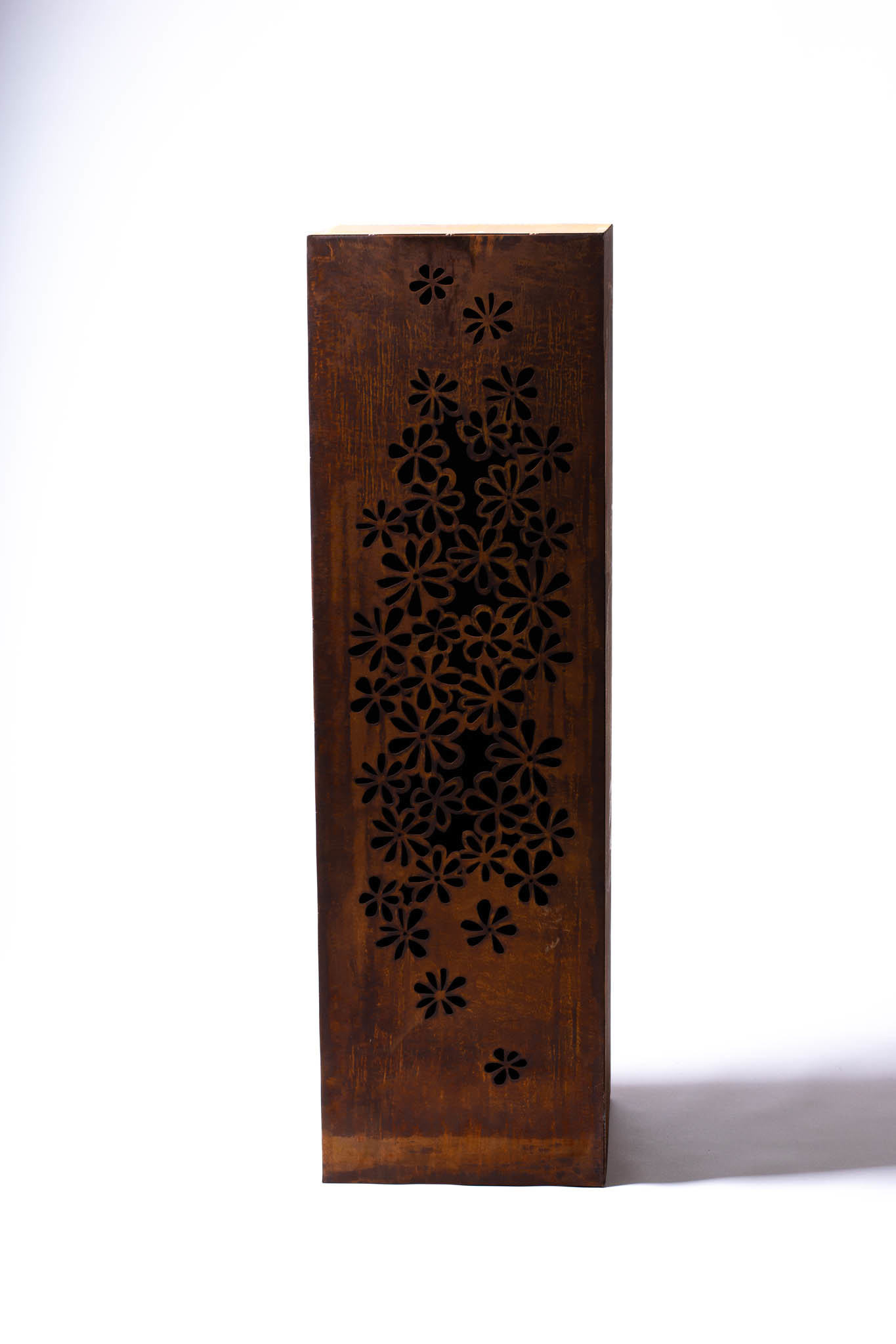 A distinctive mood creator in your garden, surely call this illuminated column. In this pedestal are so-called Flowers made on 1 side, which shines warm white light in the dark. This column is made of 2mm thick untreated iron, which gives a beautiful and timeless (rust) brown color.