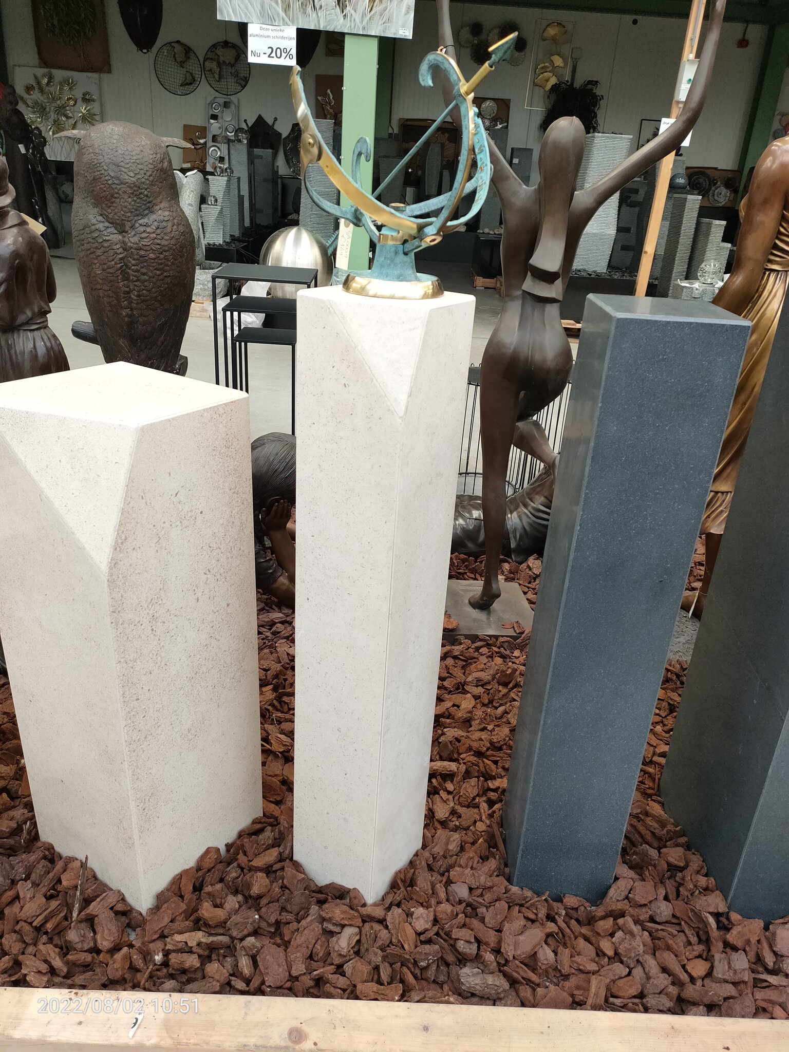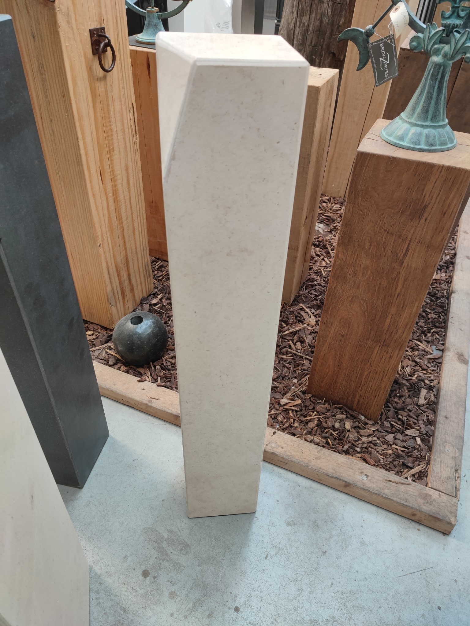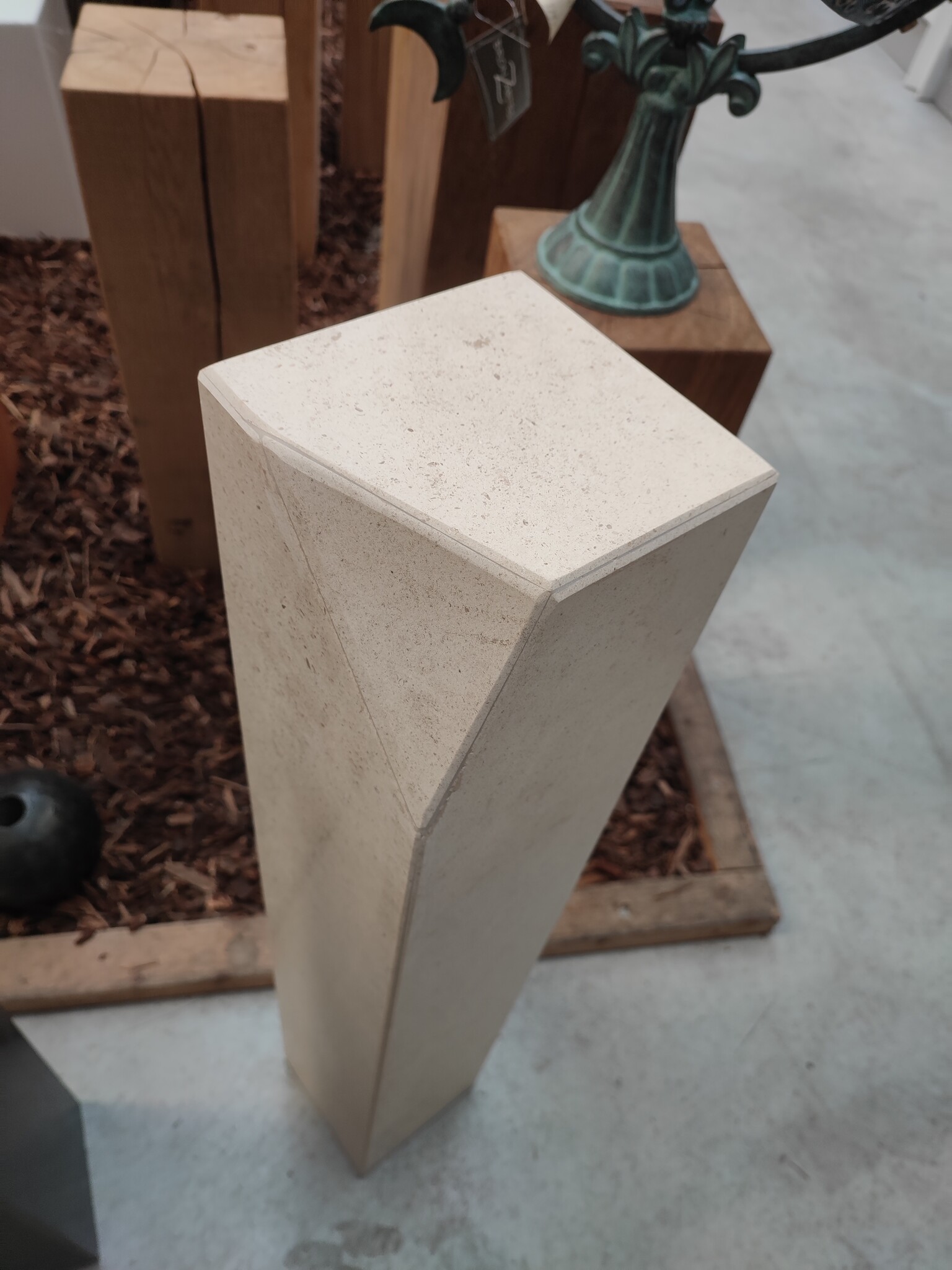 Buy stone pedestal? This pedestal is marble, all polished. With a slanted angle at the top, for a beautiful playful look combined with a modern image. Robust whole. This pedestal has a rubber base to prevent floors from being damaged.
