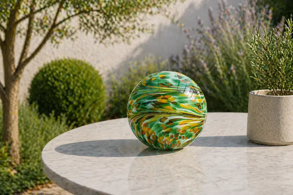 Deze opvallende decoratieve glasbol van 18 centimeter is een schitterende blikvanger voor jouw interieur of tuin. Het hoogwaardige glas is voorzien van een levendig, meerkleurig patroon waarin groene, witte, oranje en gele tinten prachtig samenkomen en zorgen voor een uniek lichtspel. Een stijlvol en kleurrijk kunstwerk dat direct een artistieke sfeer toevoegt aan elke ruimte.
