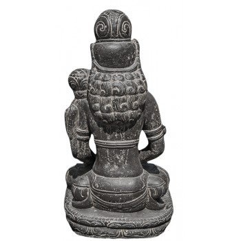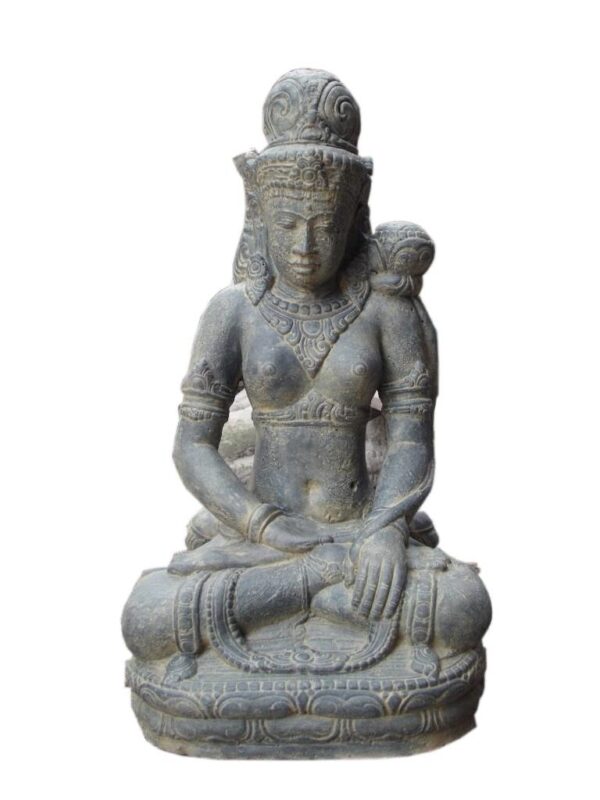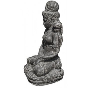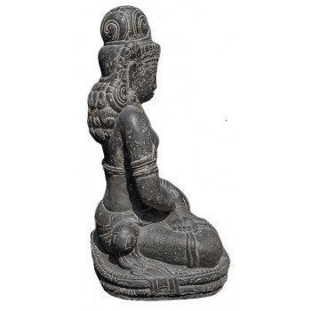 Hindu goddess Dewi Tara, sitting in loyus seat, available in 2 sizes, 50 and 70cm high. Made of cast stone in black/brown color. She has a Lotus flower in her hand, which curls over her arm to her shoulder.
