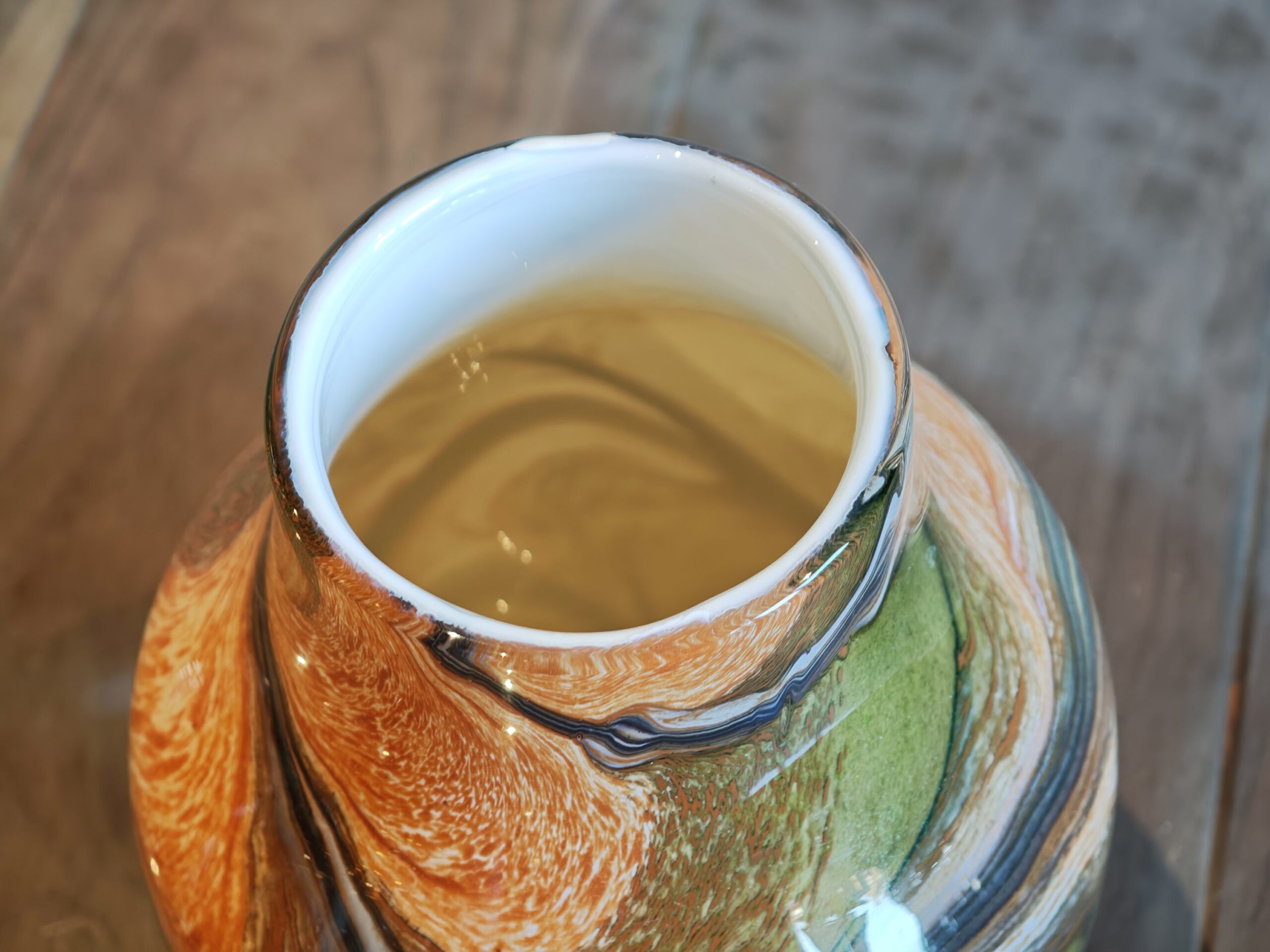 With the Fidrio vase ‘Bambini’ in the Indian Summer design, you bring the rich, warm atmosphere of autumn inside. This 20 cm tall model has a friendly, sturdy design with a wide opening, making it perfect for a compact and colorful bouquet. Where other series sometimes show jagged cracks, the “Indian Summer” collection is characterized by soft, undulating lines in which moss green, golden ochre and deep browns blend organically, like an abstract landscape.