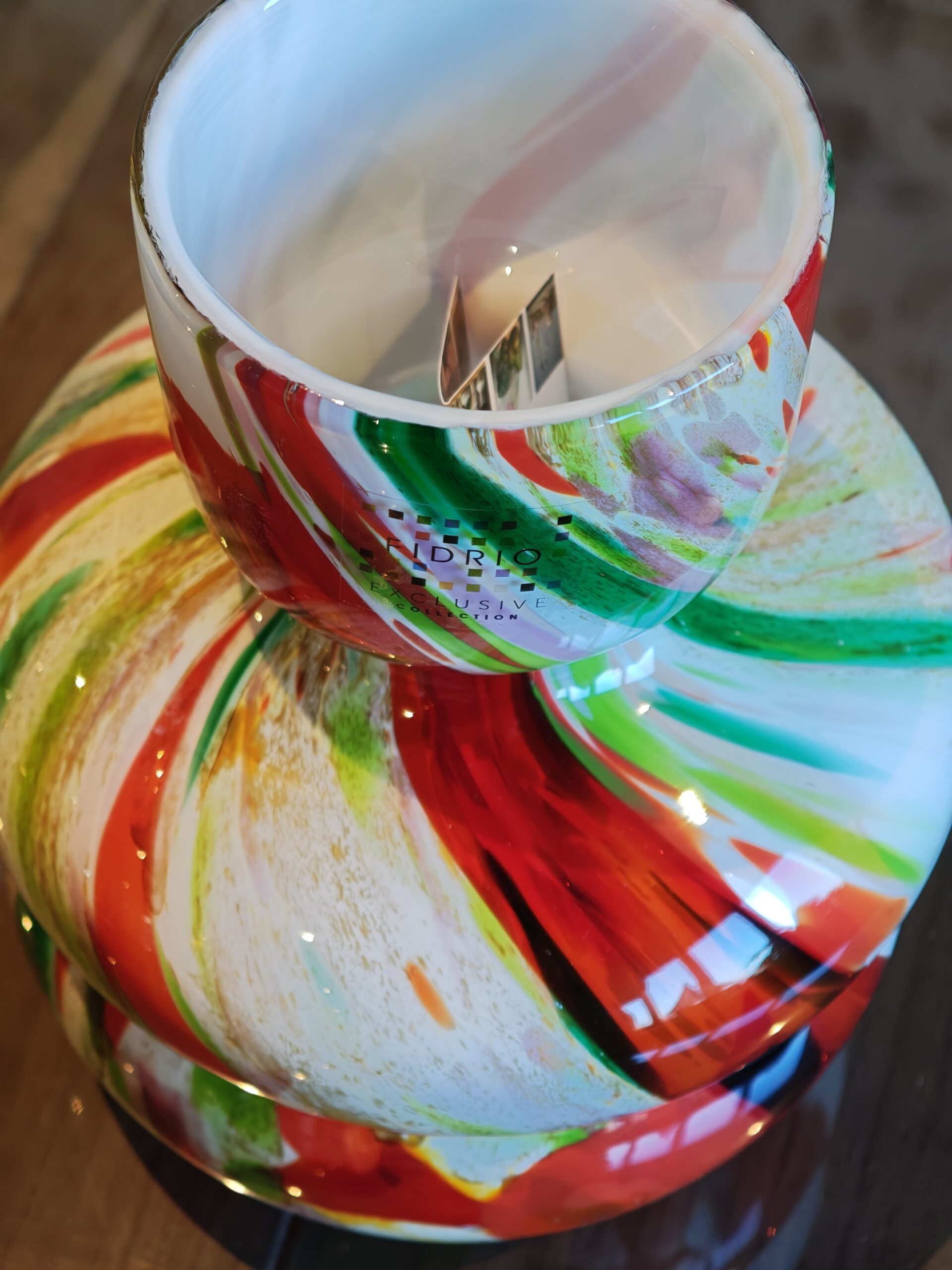 Give your interior a playful and colorful twist with the Fidrio vase Sienna in the ‘mixed colors’ design. This unique model, with a height of 25 cm, stands out for its special design characterized by graceful curves and a narrowed neck. The mouth-blown glass forms a clear canvas for a vibrant display of colors, alternating powerful red and green hues with subtle white and gold accents.