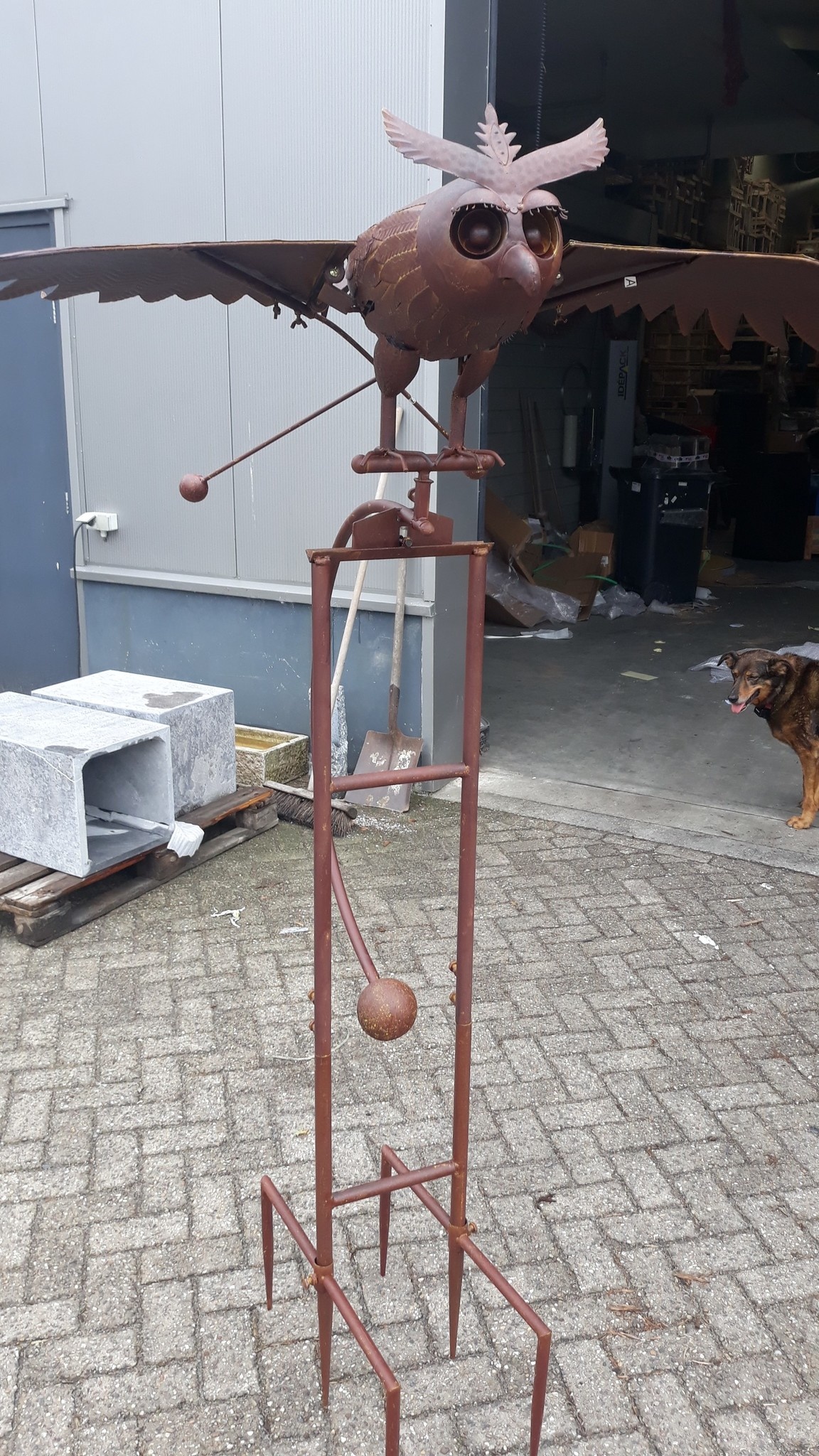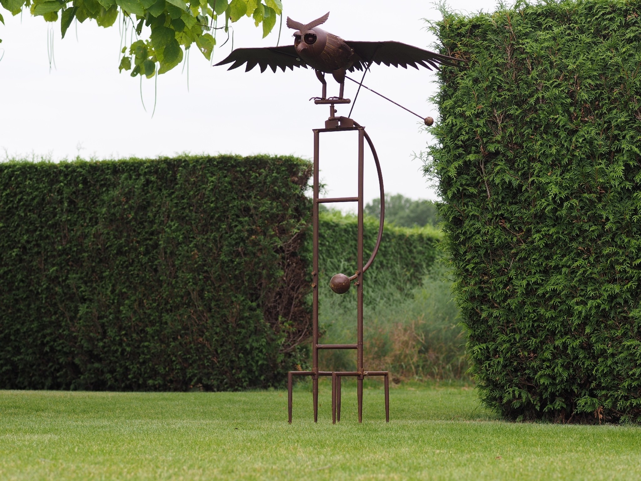 Super-sized is this piece of garden decoration. This large Owl makes flight movements with its wings using wind and balance weights on the wings and tail. In strong winds, this model eagle flies endlessly up and down.Counterweights in the form of metal balls. Made entirely by hand from iron.