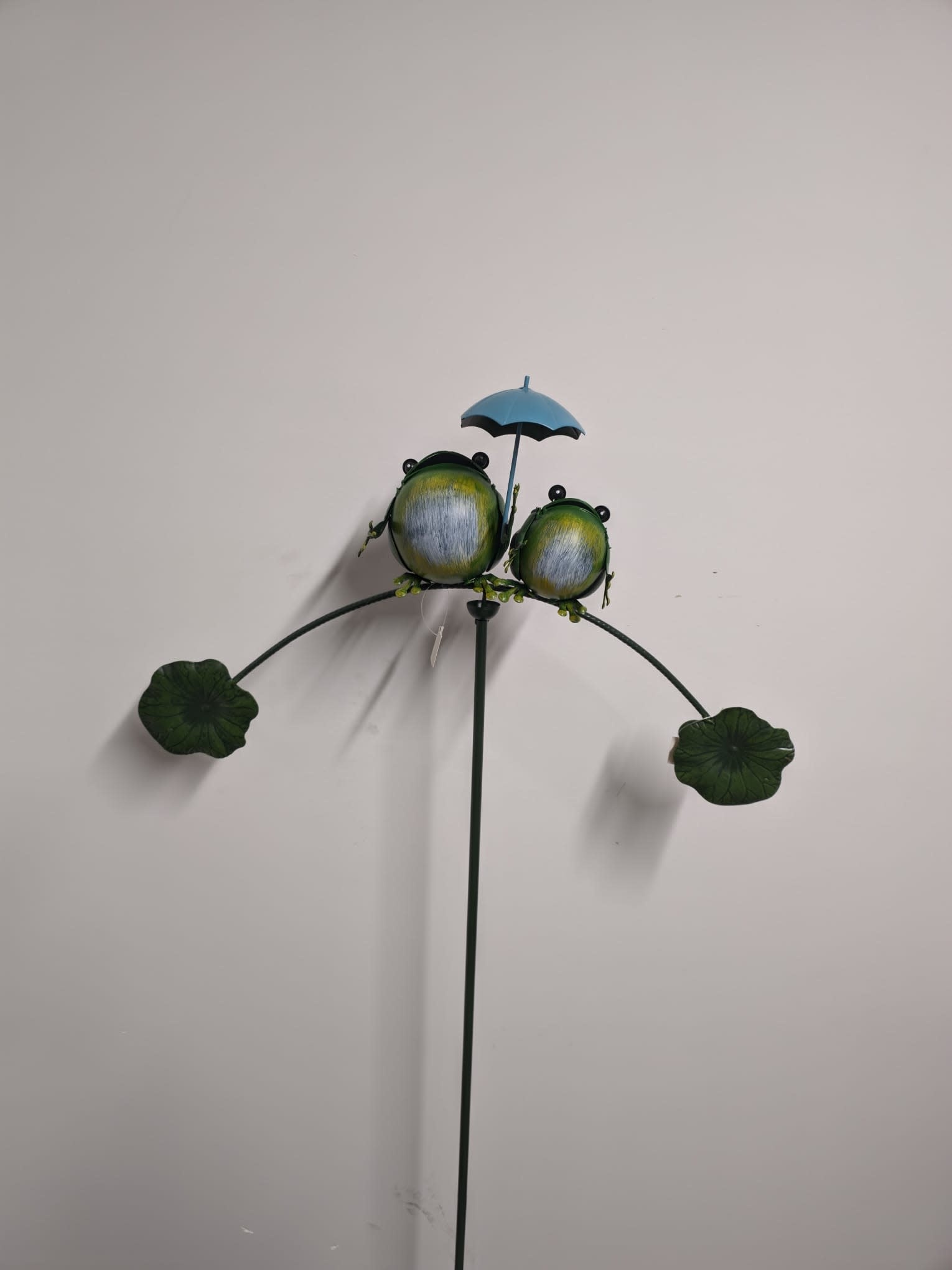In any garden, this brightly colored garden stick with two frogs under a blue umbrella will be a fun addition to your garden.