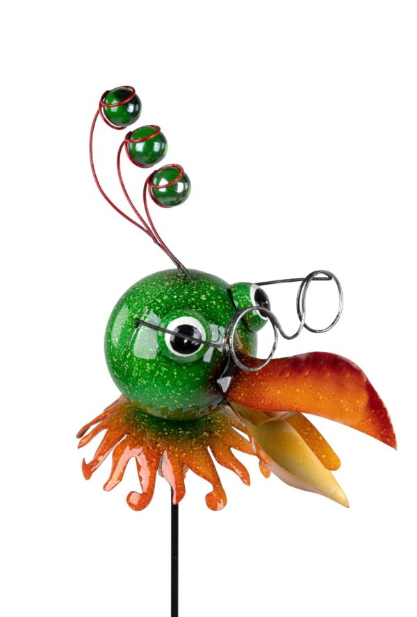 Will you make your self or someone else happy with this cheerful garden stick of a green funny fantasy bird?