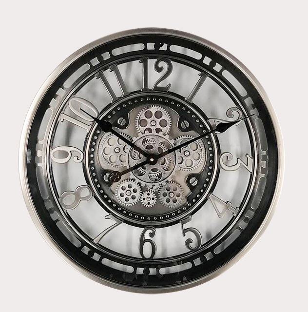 It will be a joy to see what time it is now, with this beautiful round nickel colored wall clock with moving parts. This very nice clock has a steel frame in a black color, with subtle numerals.
