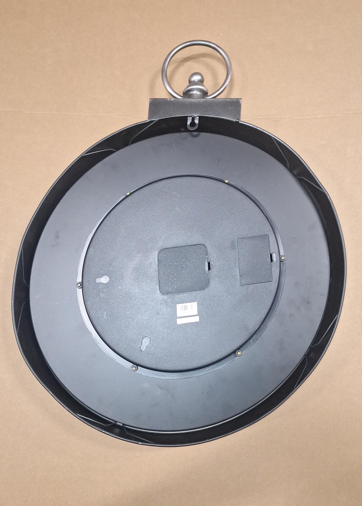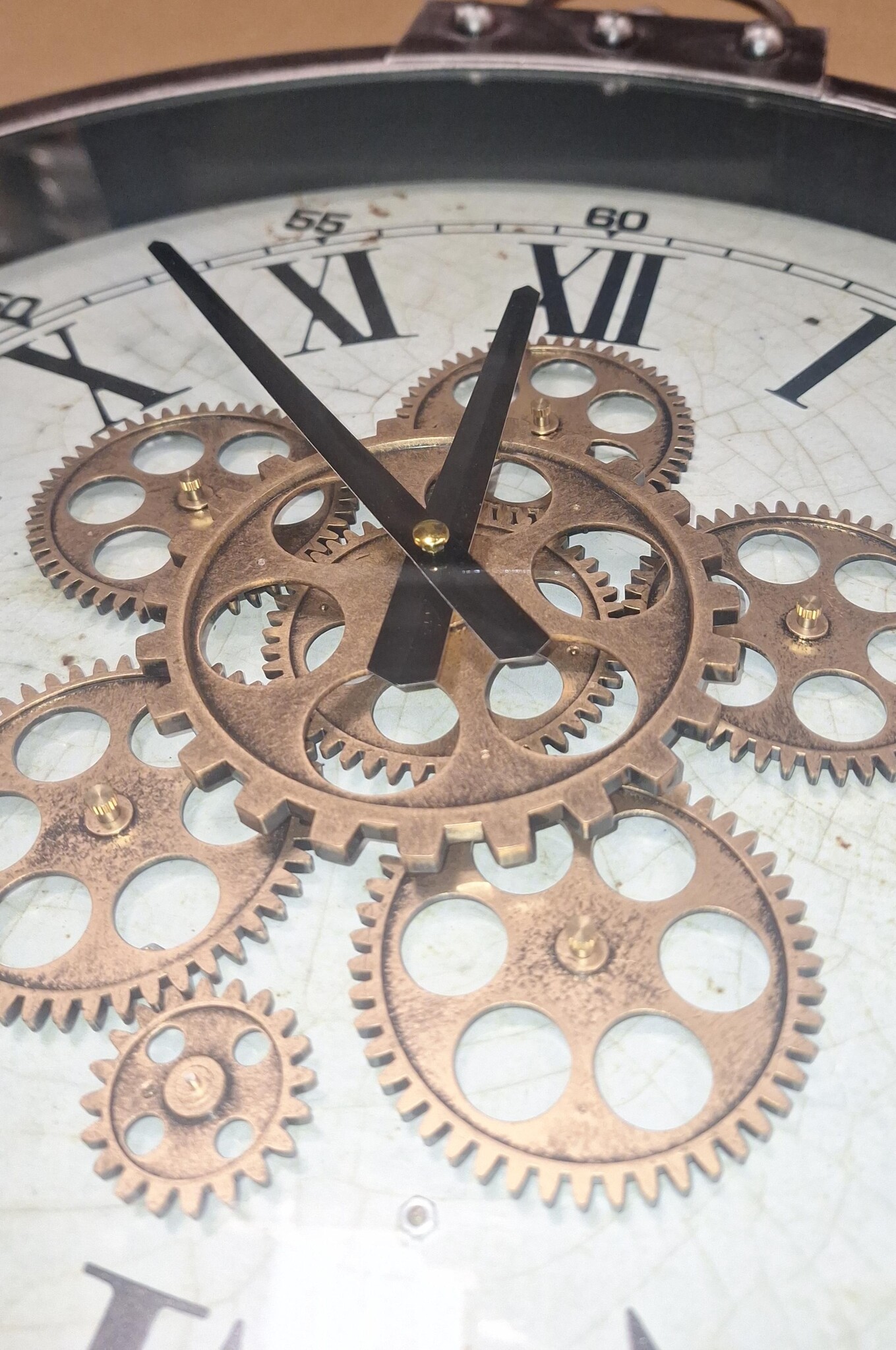 It will be a joy to see what time it is now, with this beautiful open round anthracite colored wall clock with moving parts. This very nice clock has a steel frame in an old gray color, with roman numerals.
