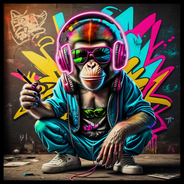 This is a square glass plate with a modern rendered monkey wearing eye-catching headphones.