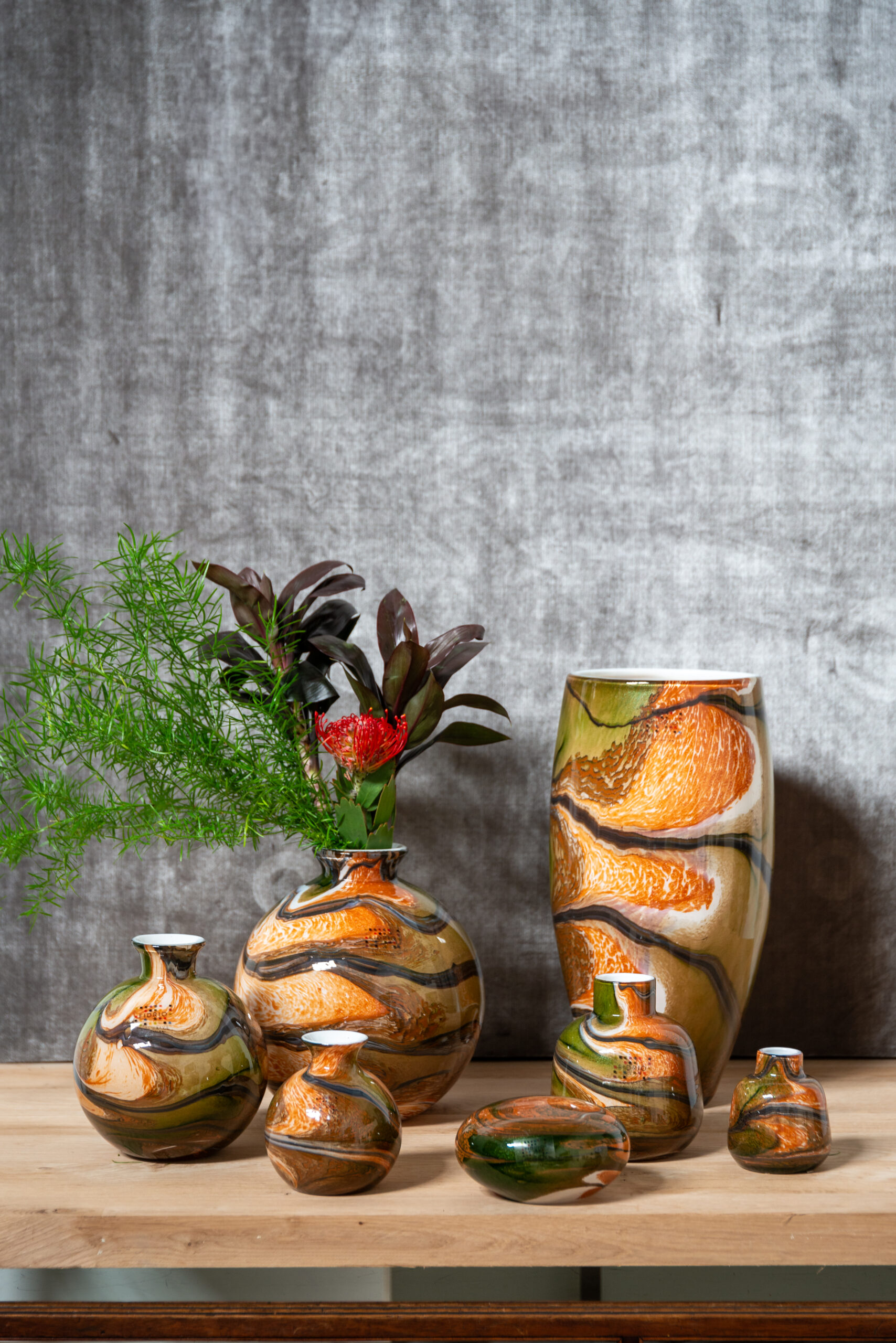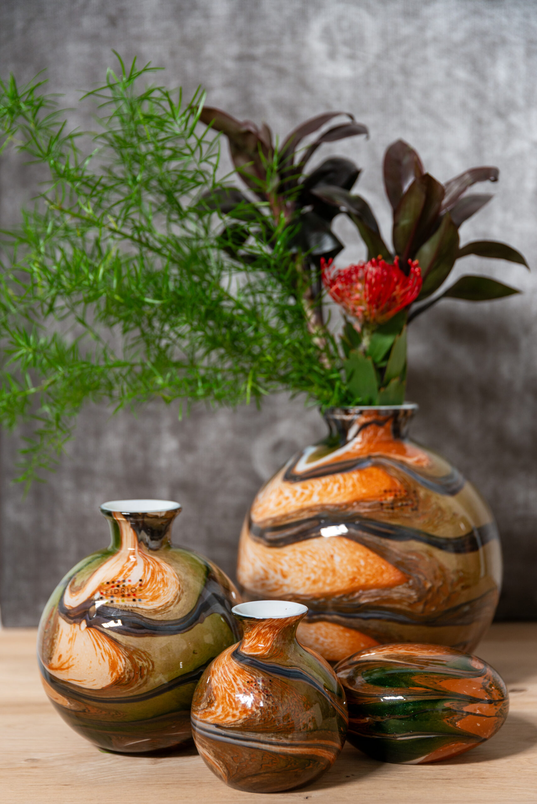 All of Fidrio’s glass vases are handmade in the traditional, artisanal manner. The workable super hot glass is blown into a wooden mold, with the mold serving as the basic shape, but the hues and thus the look will be different with each vase. The sizes given are always Circa sizes.