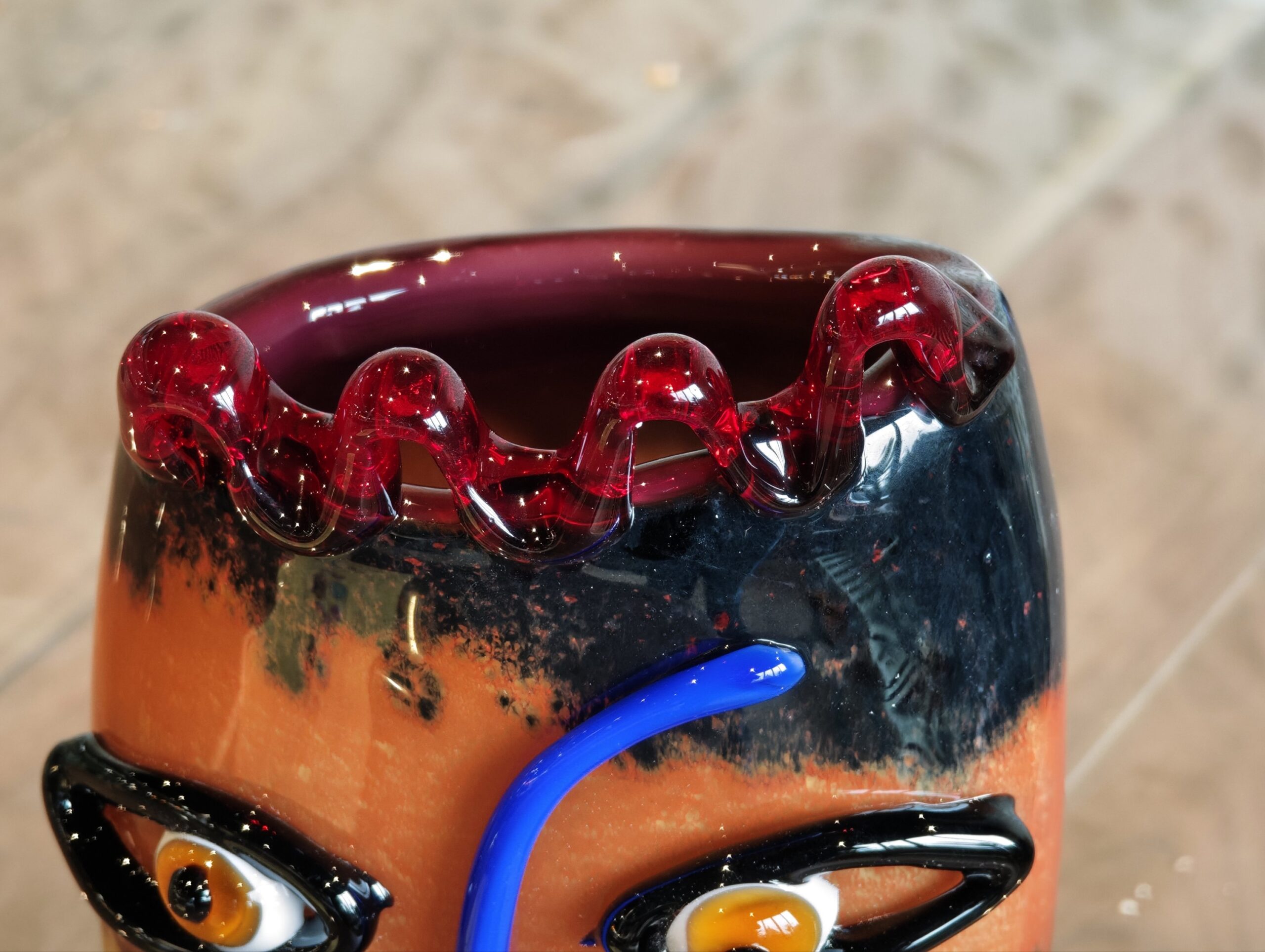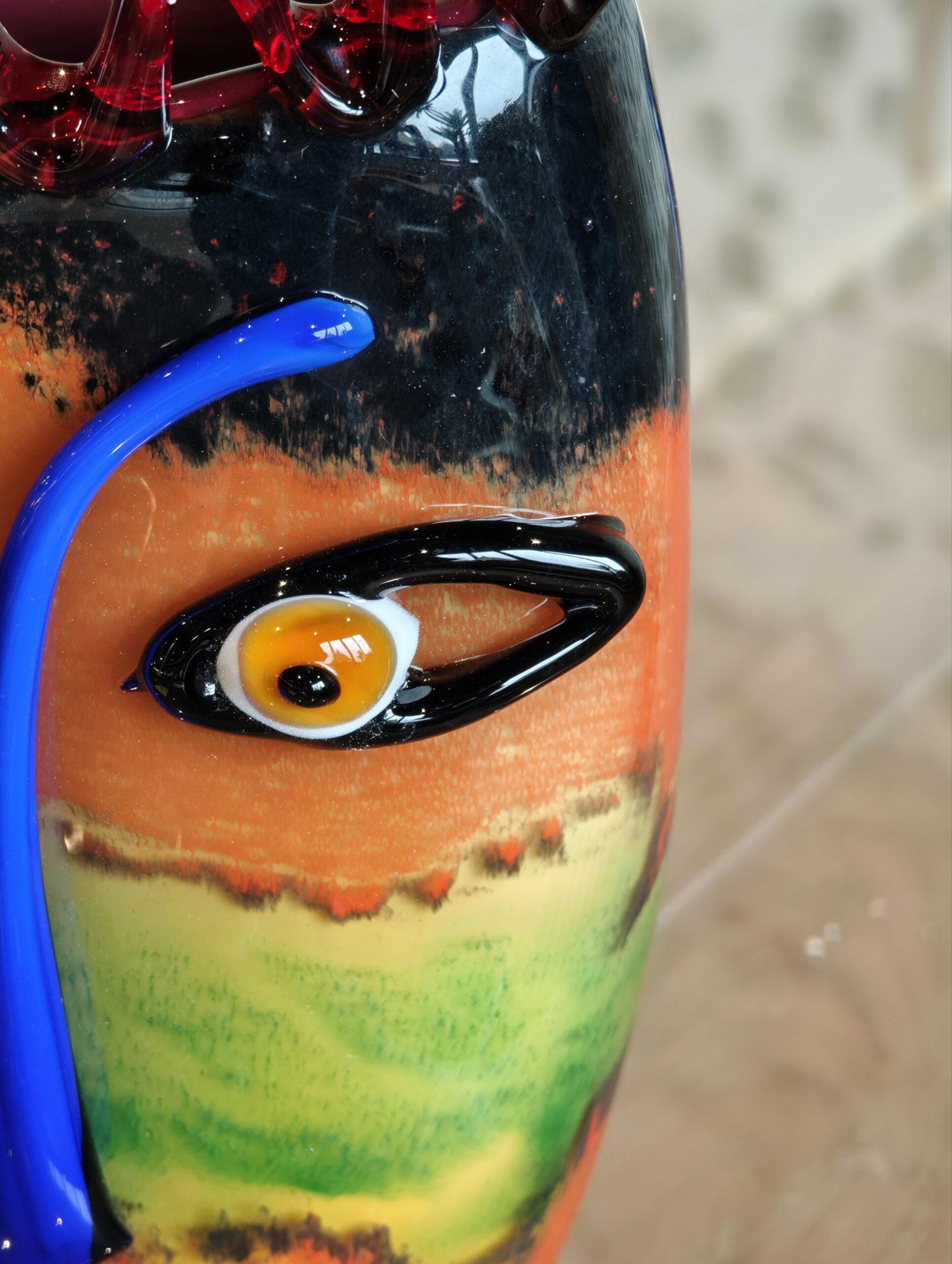 This colored decorative vase with like abstract face incorporated on it is made on the old-fashioned artisanal glass-blowing technique. What is special is how in the traditional way from different colors of glass this beautiful model of glass vase was obtained.