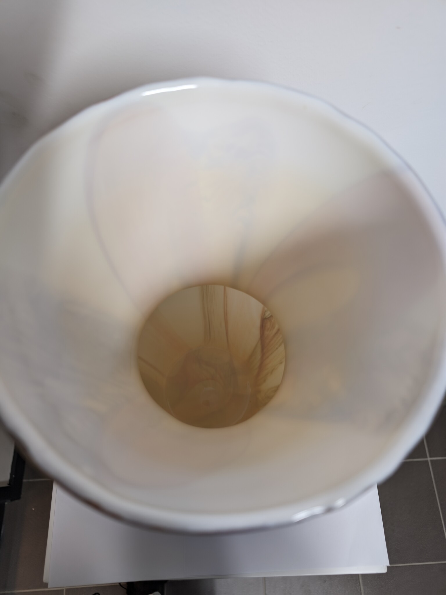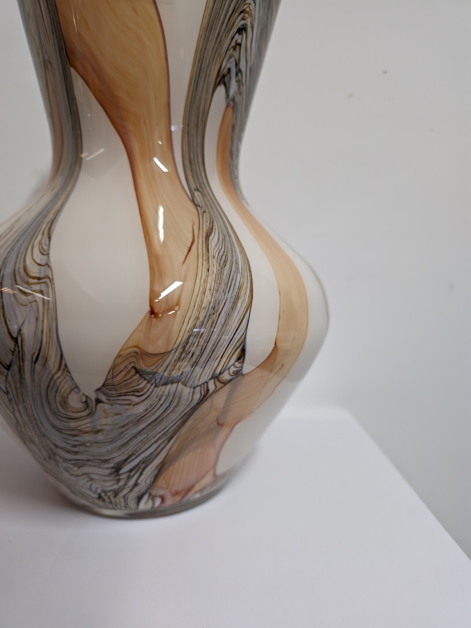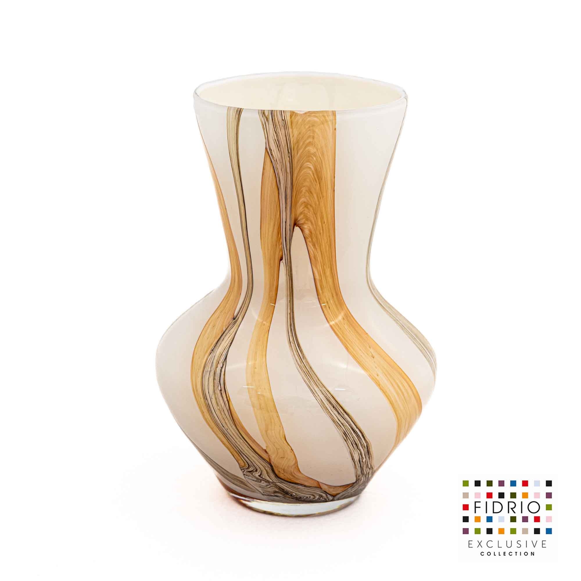 All fidrio glass vases are handmade in the traditional, artisanal manner. The workable super hot glass is blown into a wooden mold, with the mold serving as the basic shape, but the hues and thus the look will be different with each vase. The sizes given are always Circa sizes.