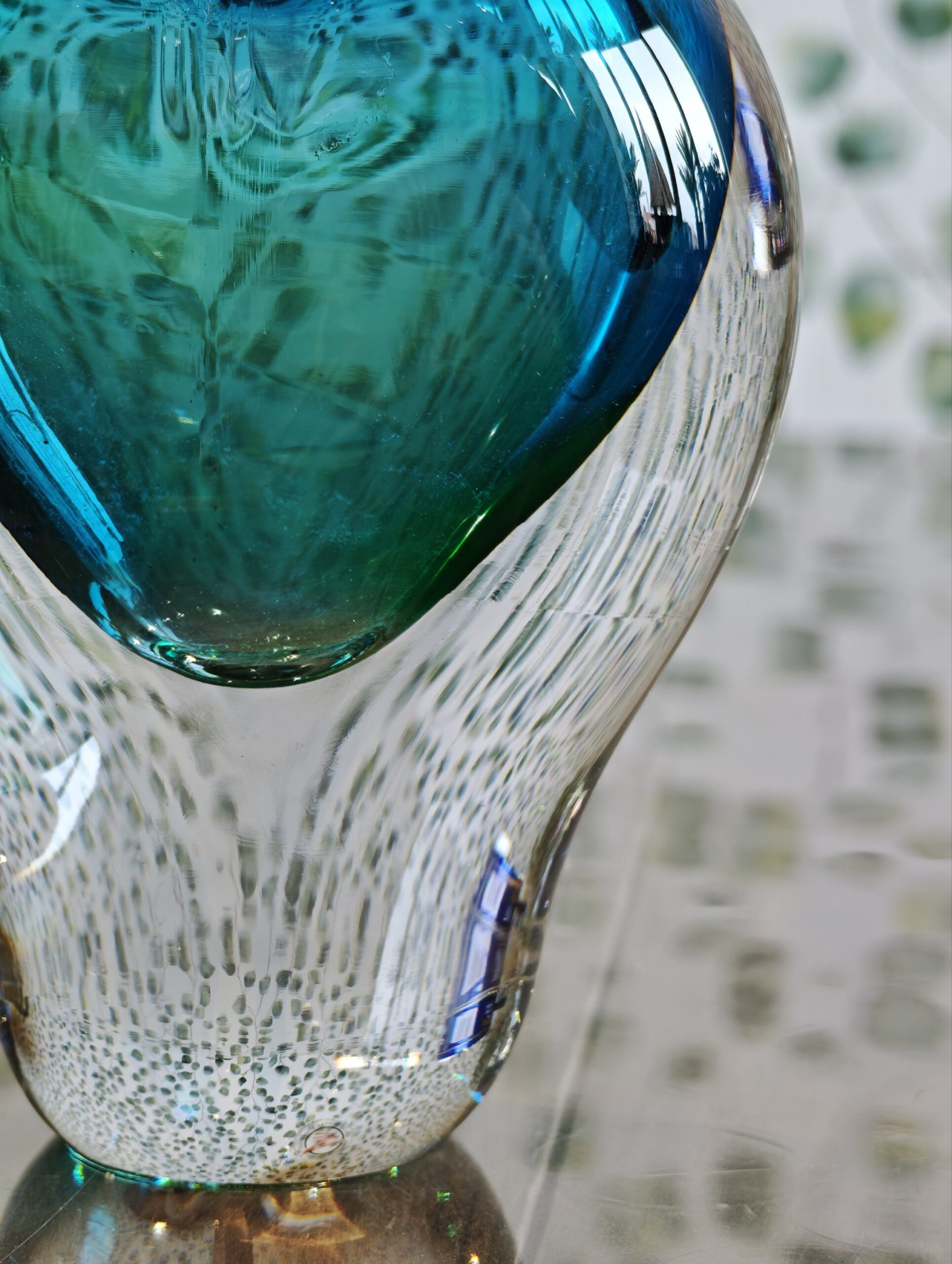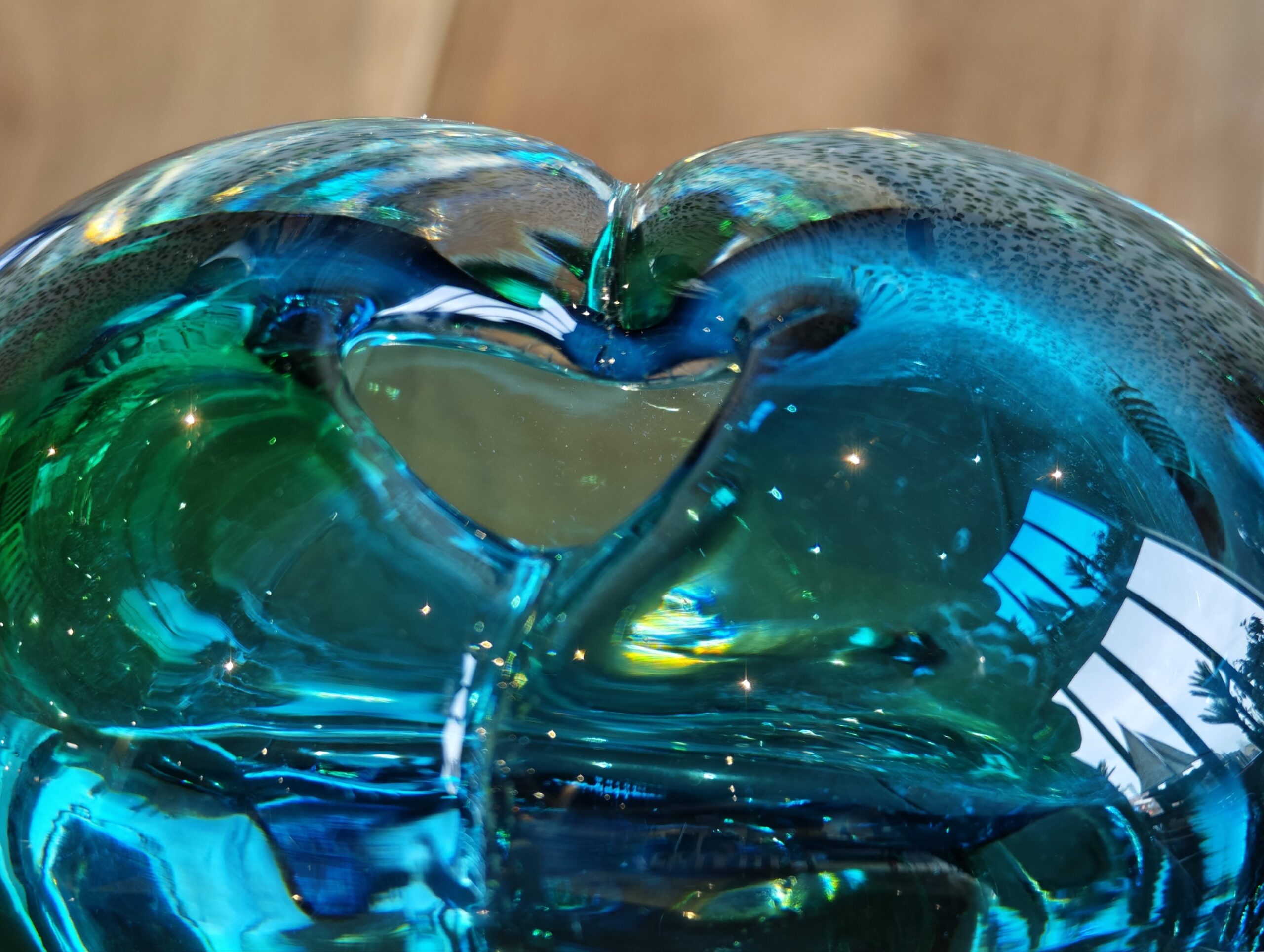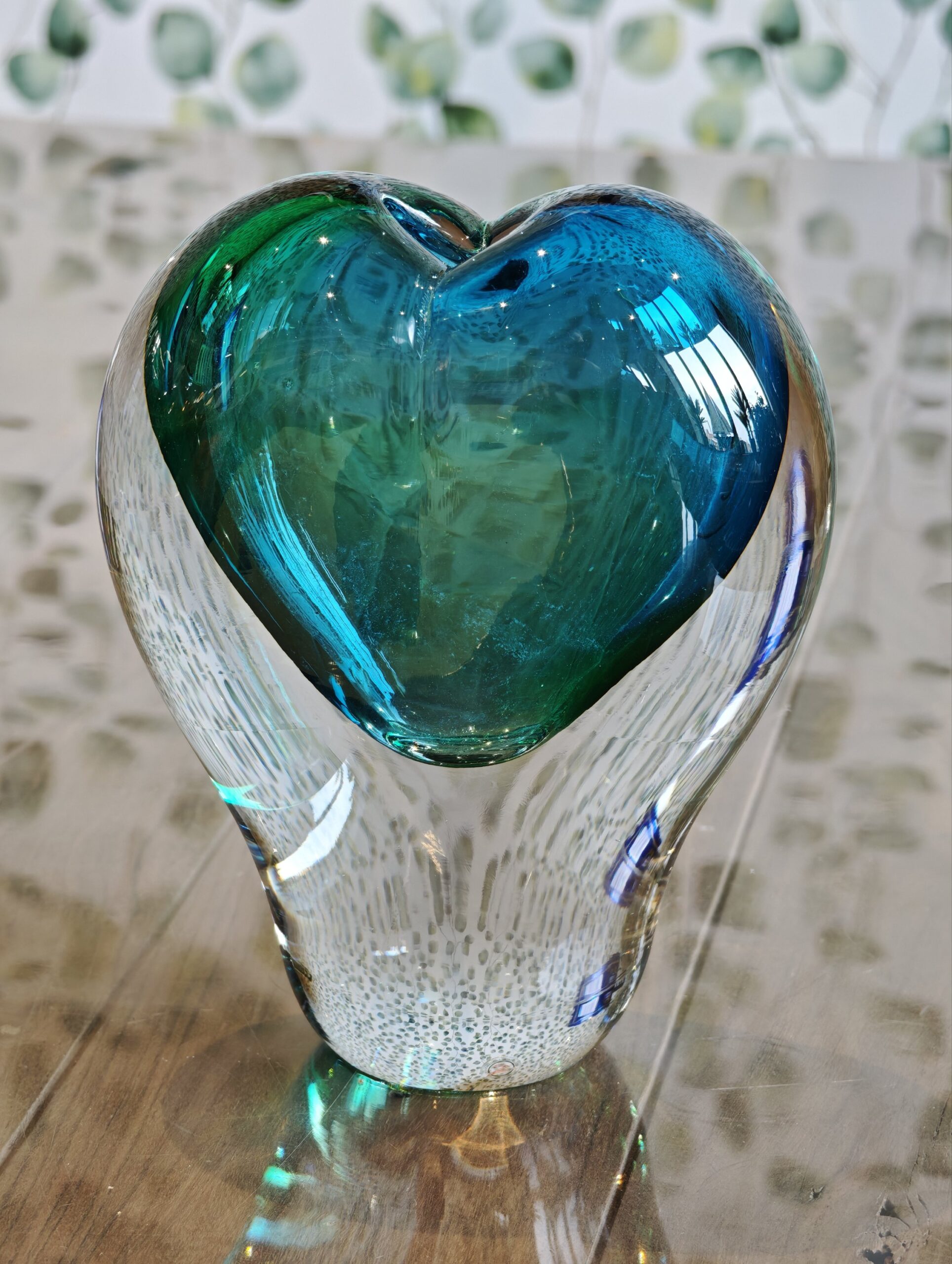 This handmade 20 cm tall heart-shaped vase is crafted from high-quality Bohemian crystal with an enchanting blue-green center. Thanks to artisan handcrafting, each one is unique, creating an exclusive play of colors and a timeless symbol of love in your home.