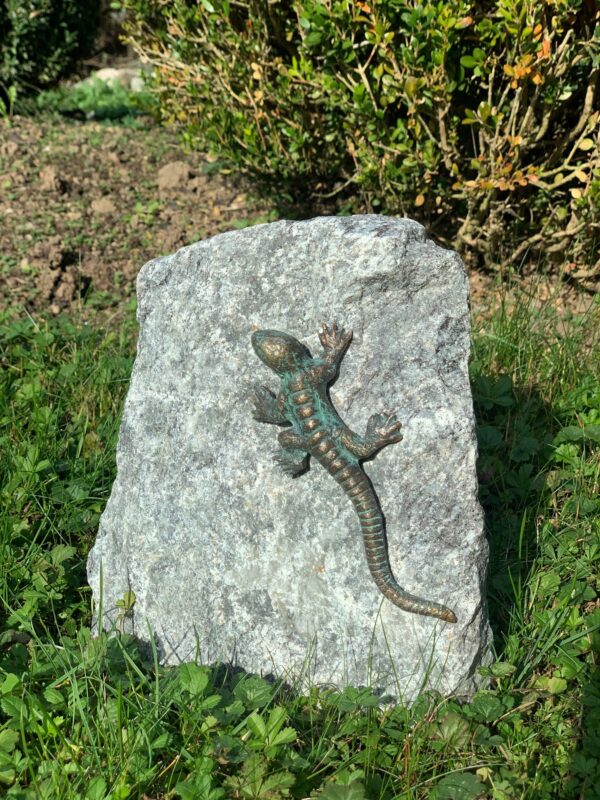 Beautiful sculpture of a lizard made of high quality bronze, on a high chunk of granite from the black forest. This bronze is of high European quality, with a minimum copper content of 75% ensuring a very long life. Because this is a natural product, the shape and color always differs from the photo.