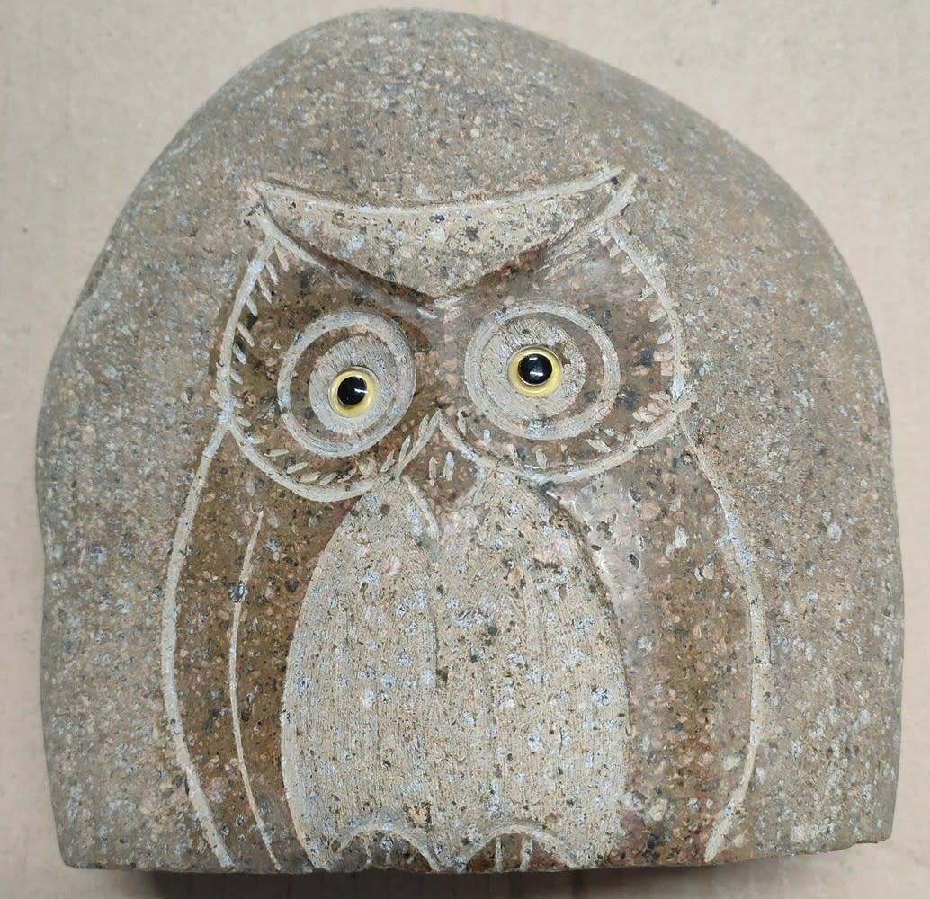 Beautiful stone statue of an owl, handmade on a 15cm boulder. First the image is drawn on the boulder, then a chisel is used to carve out the lines and some surfaces, creating depth differences. The highest lying parts are then carefully polished. A huge job, but the result is worth it.
