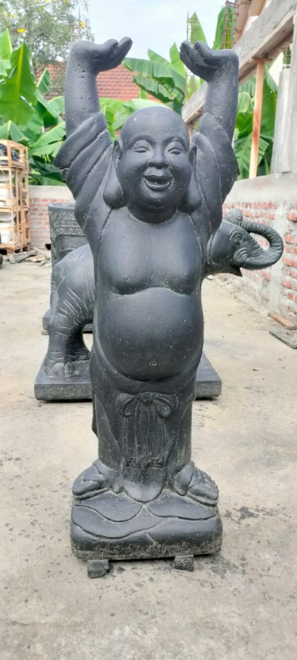 This happy Buddha is made of high-quality cast stone with a very high cement content, so all these statues can withstand all weather conditions with ease. The color is black/ and may always vary slightly from the photo because all of this series is handmade.