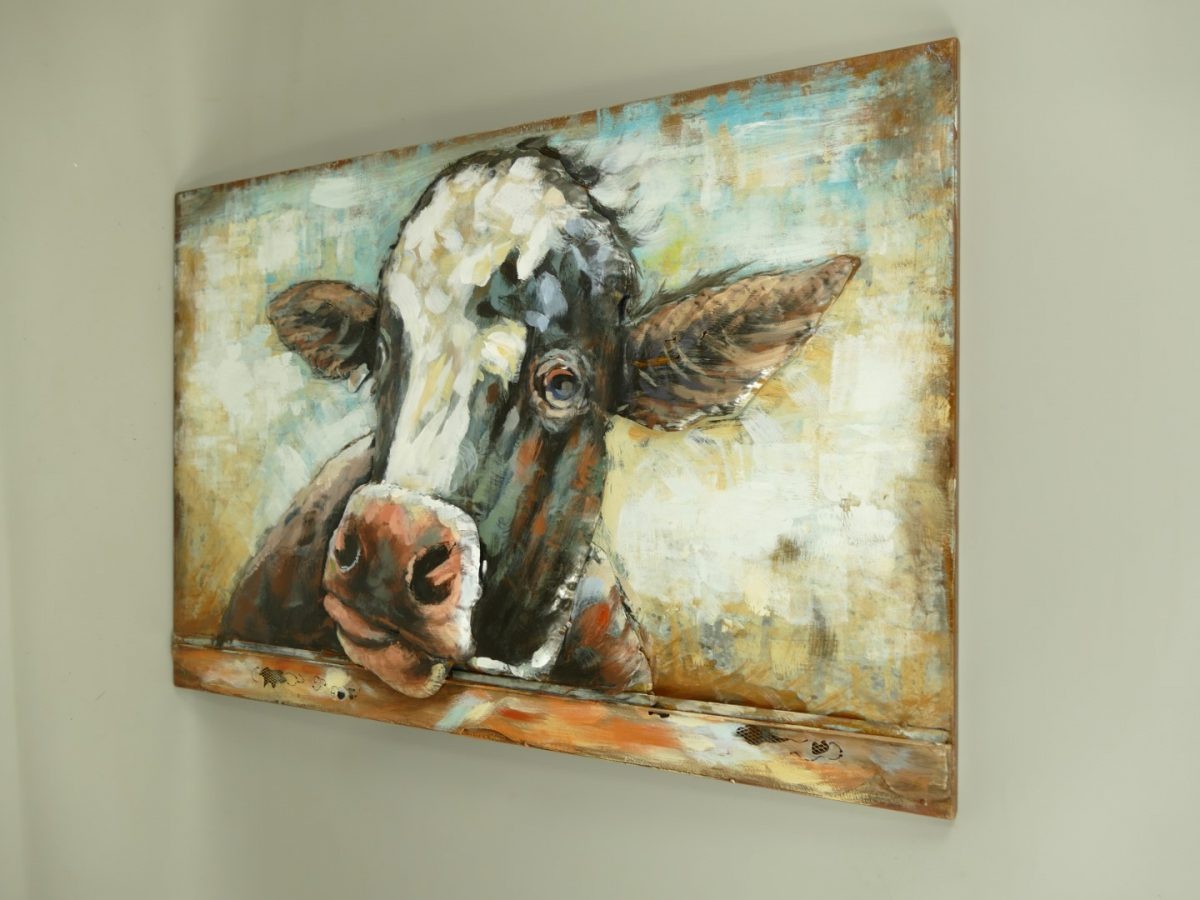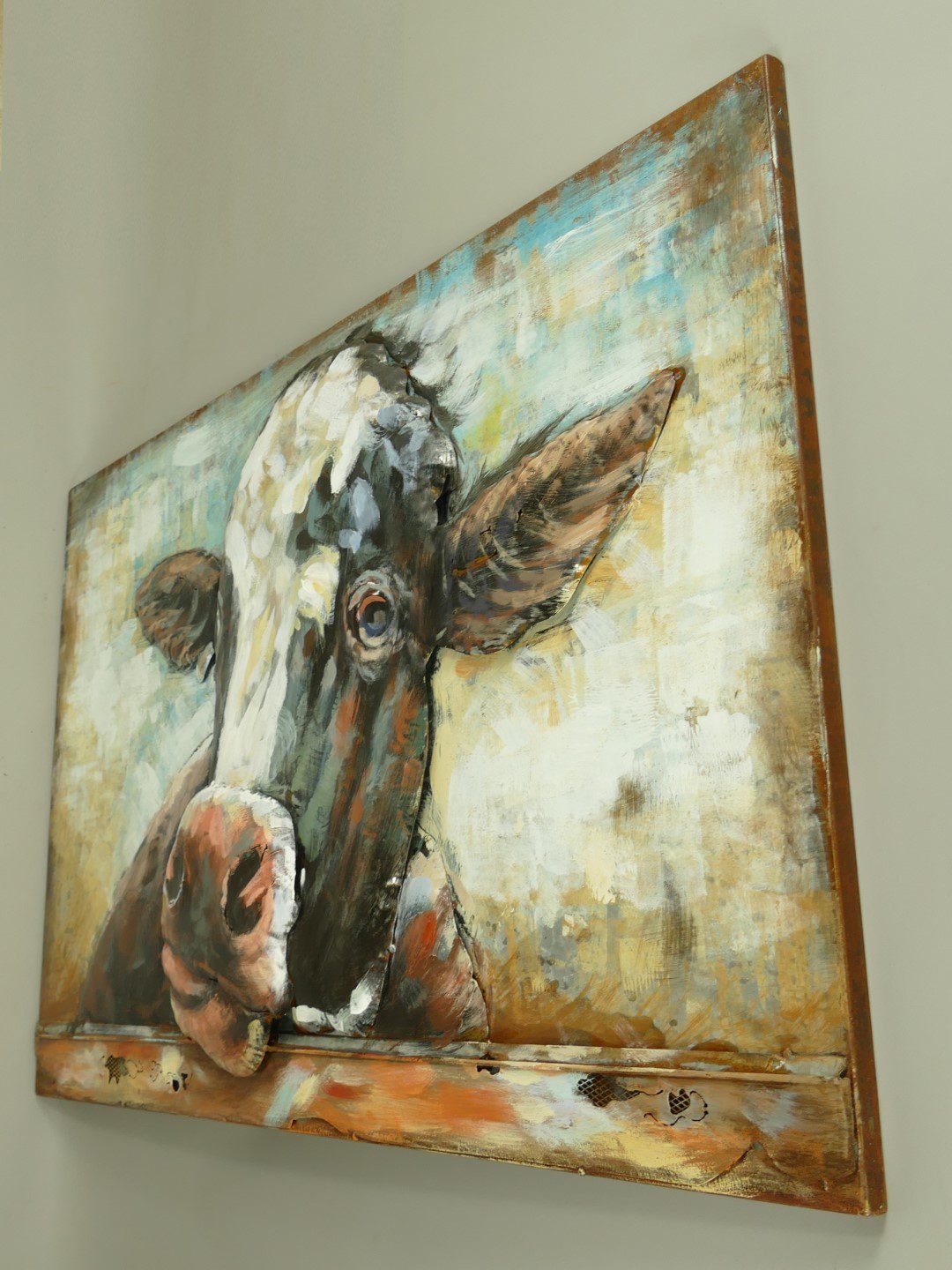 A beautiful 3D Metal painting, with the image of a happy cow, sublimely made from separate parts of metal, all welded together by hand, for an optimal 3d effect. A beautiful piece of wall decoration for your home, outside under a canopy or in your business. Colors and overall appearance may vary from the photo as this entire item is made by human hands.