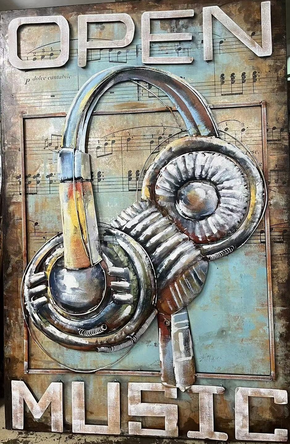 A beautiful 3D Metal painting, depicting a number of music attributes such as headphones, microphone and sheet music, sublimely made from separate parts of metal, all welded together by hand, to achieve an optimal 3d effect. A beautiful piece of wall decoration for your home, outside under a canopy or in your business. Colors and overall appearance may vary from the photo as this entire item is made by human hands.