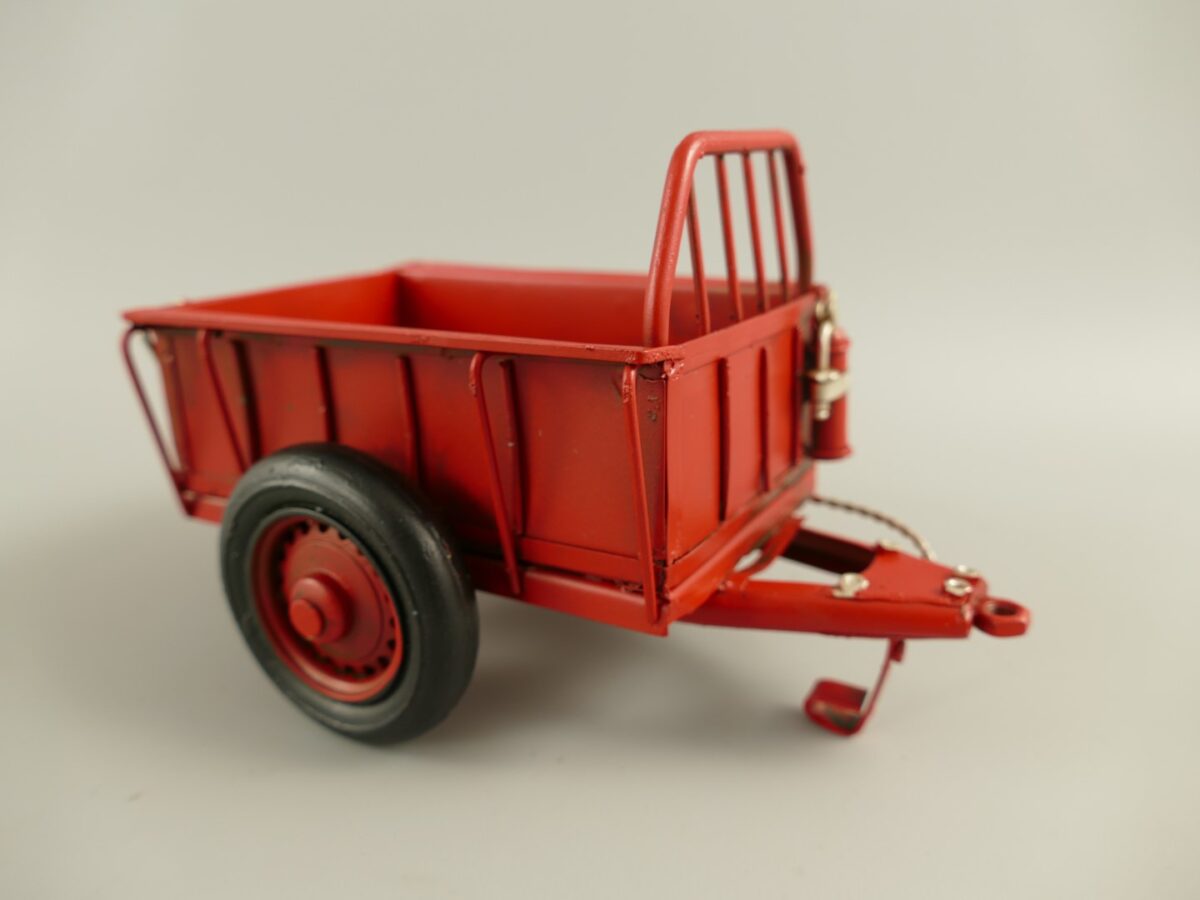Beautiful handmade miniature model of a red tractor with trailer.