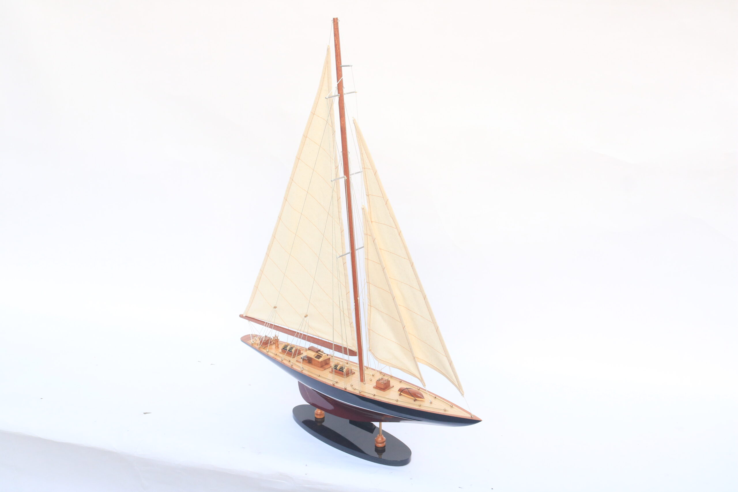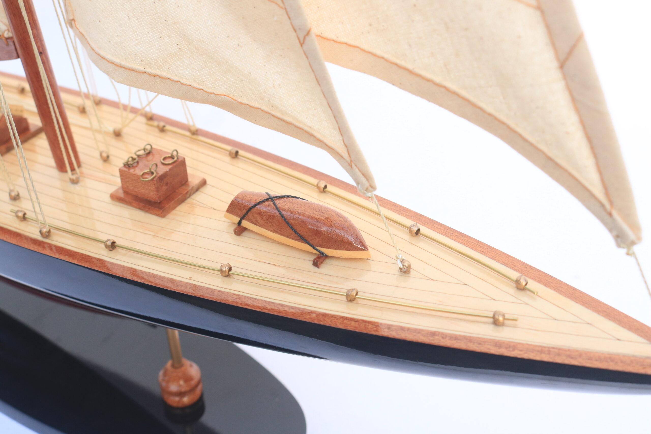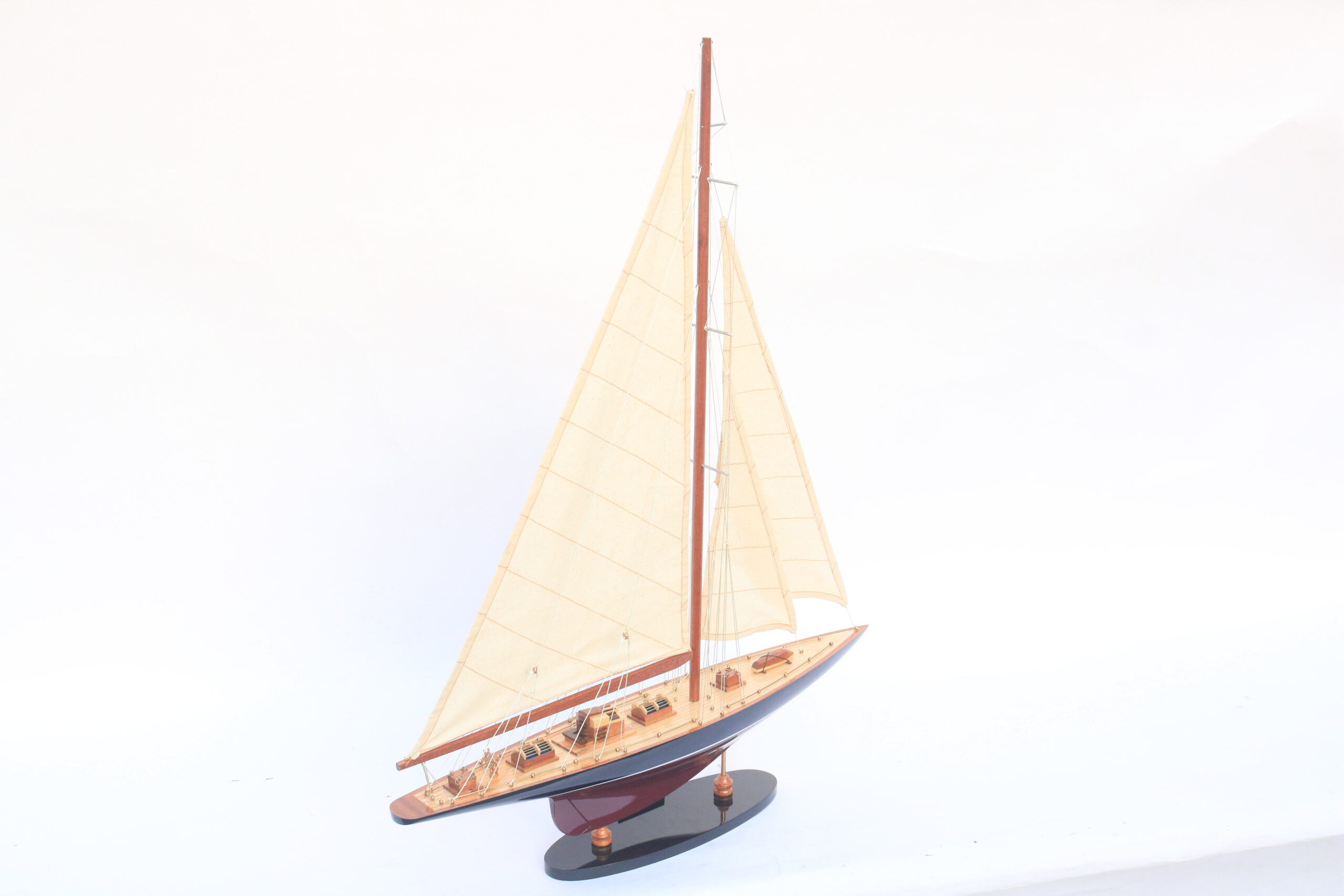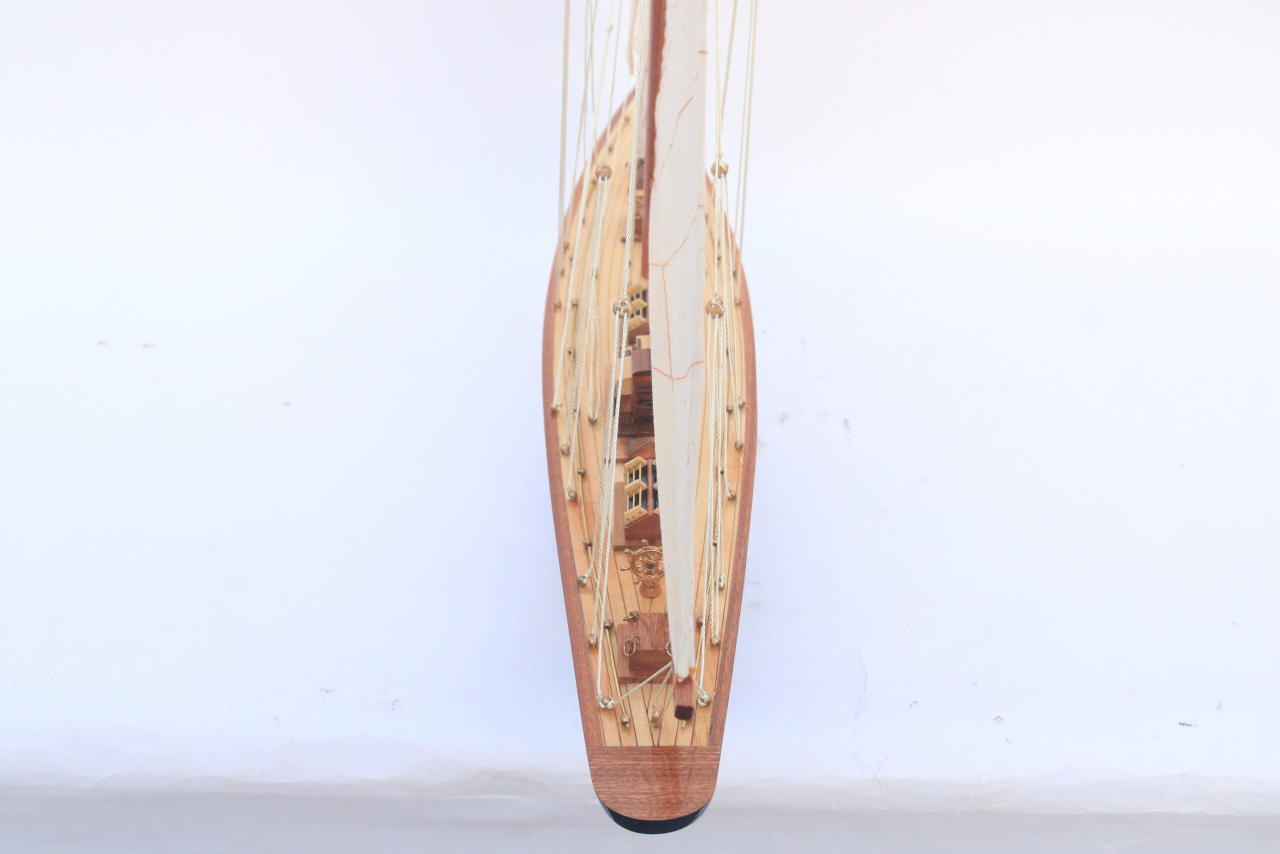 You will receive a box containing this wooden boat, you must raise the mast upon receipt, and then carefully tighten/slide the appropriate lines and linen sails.