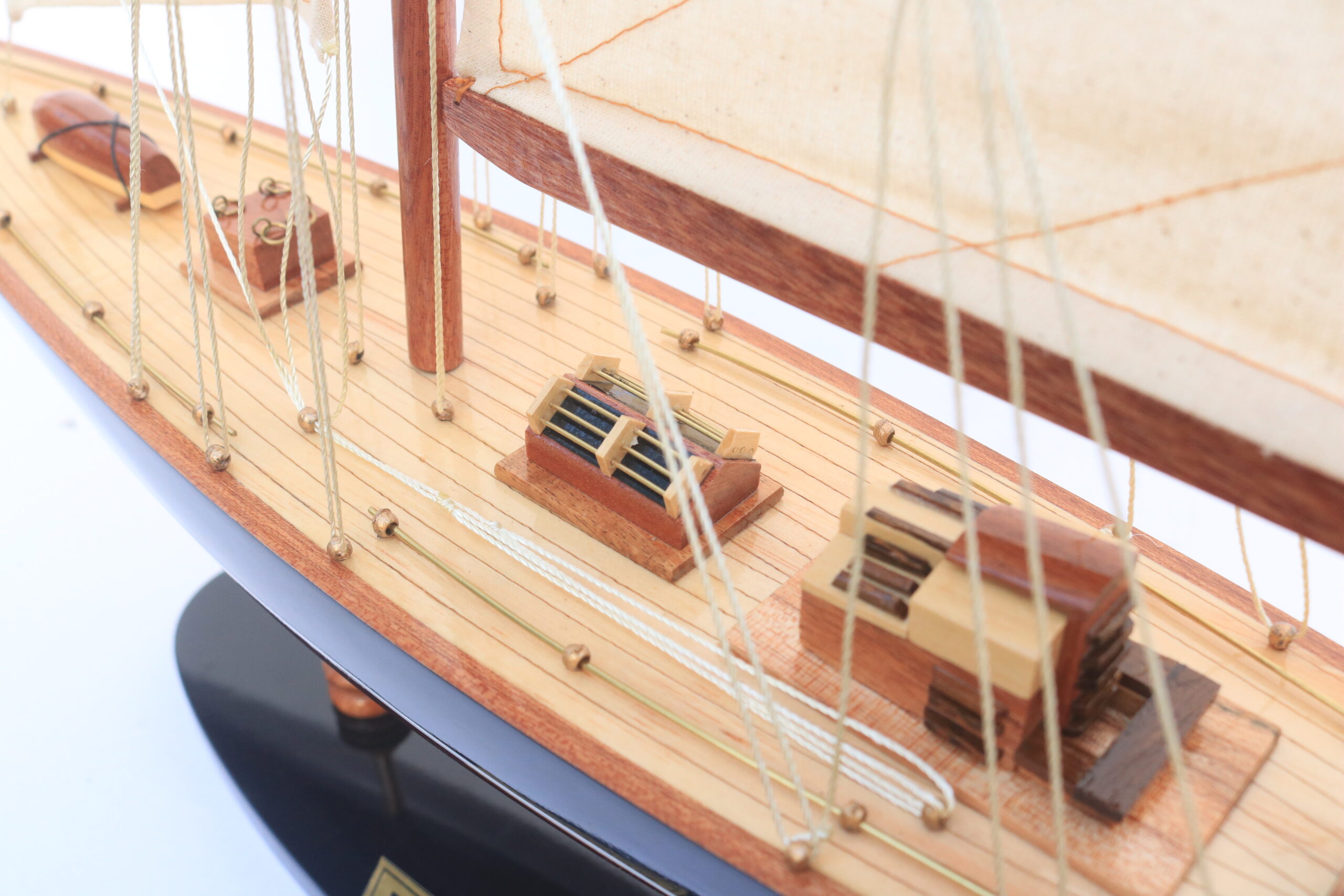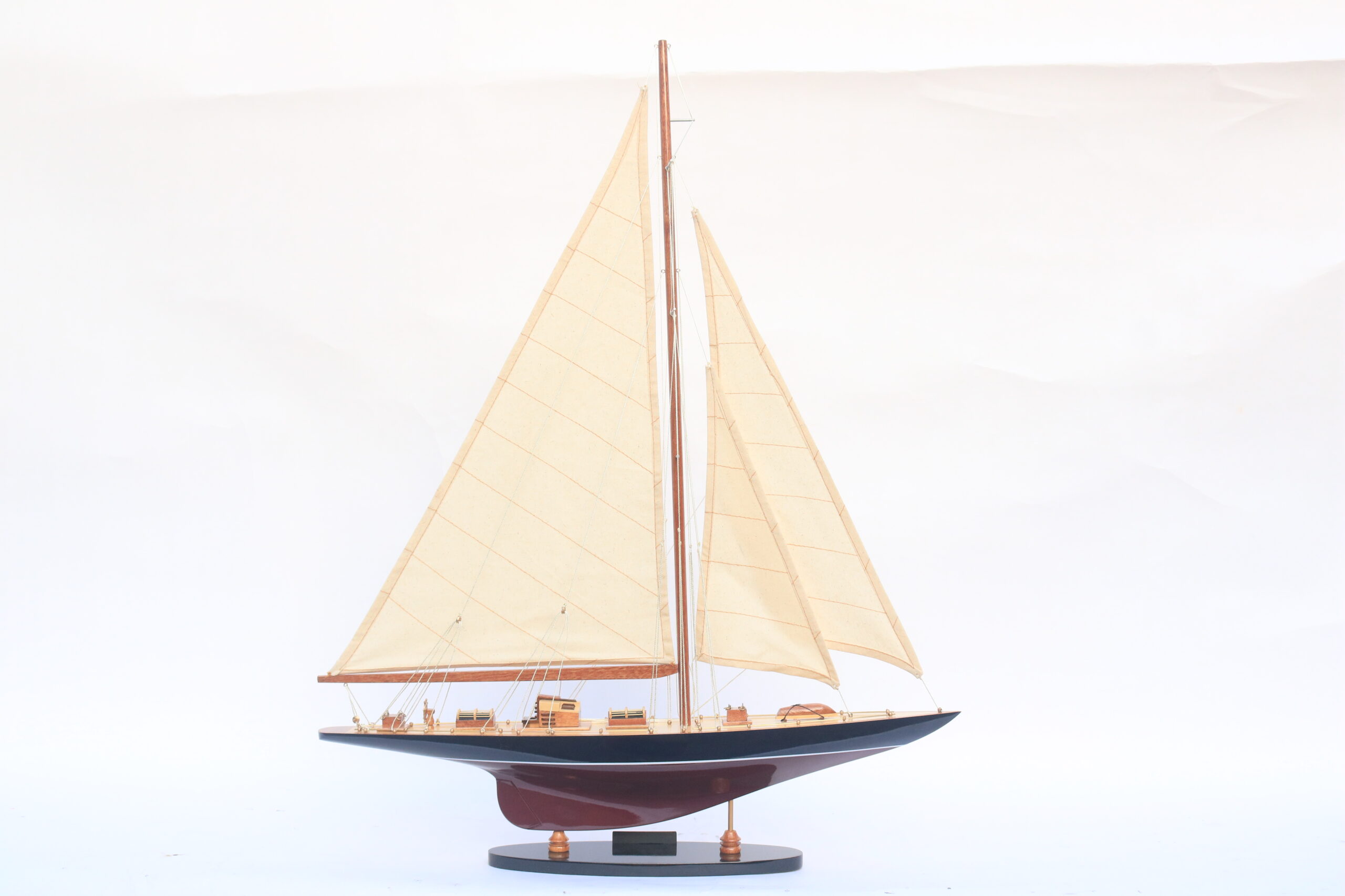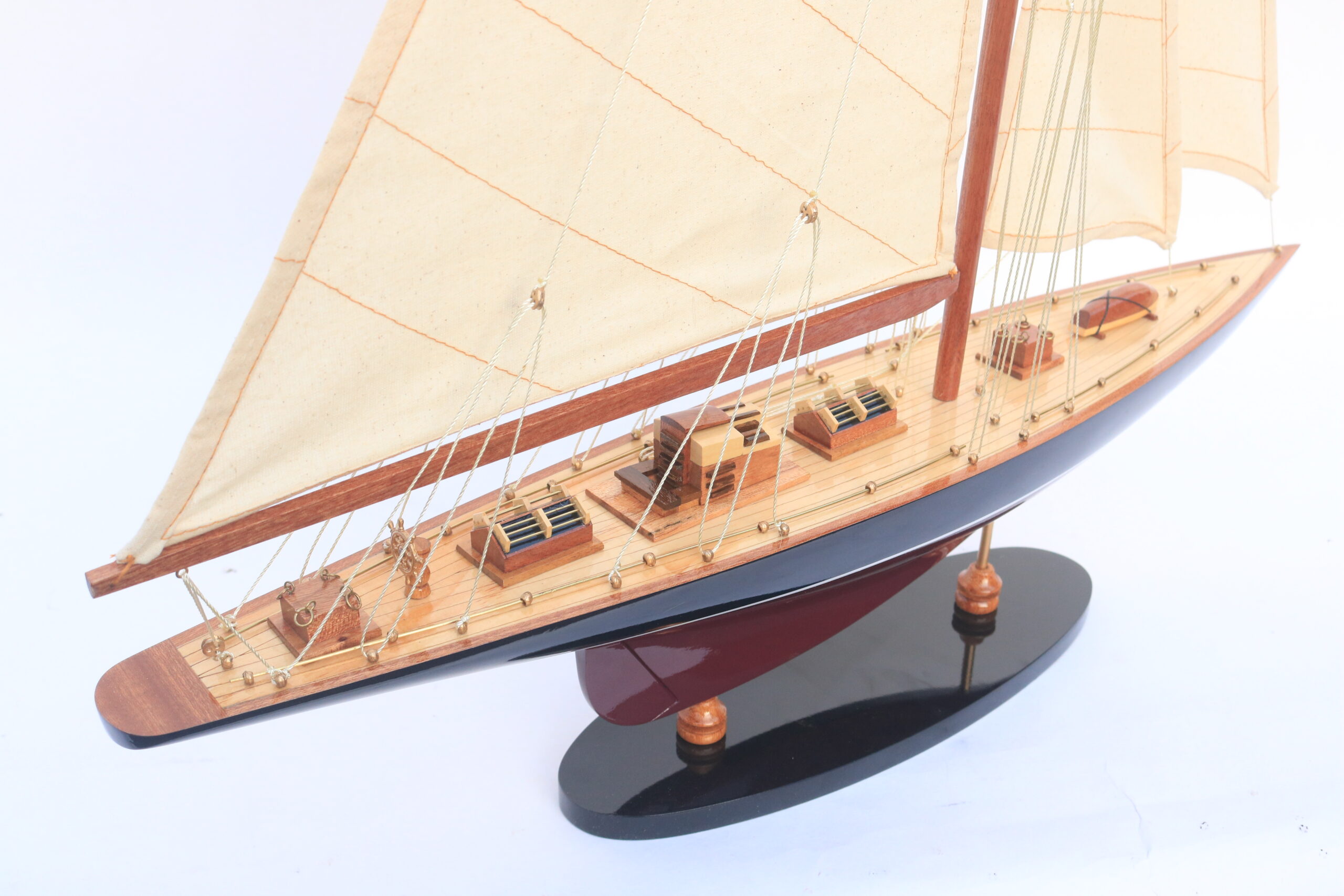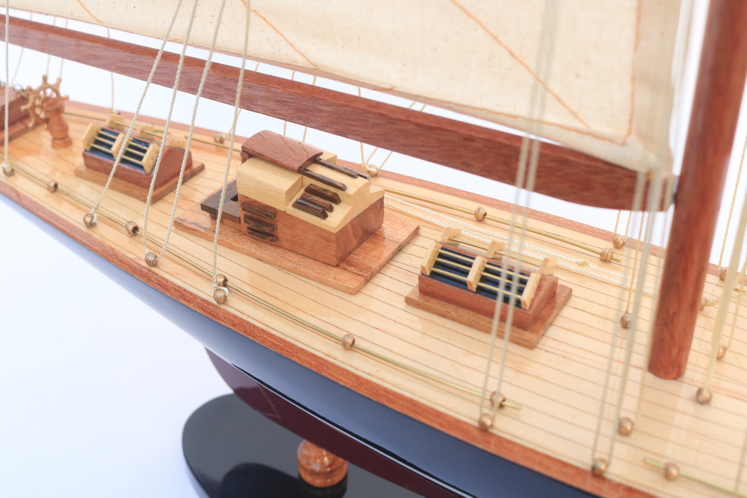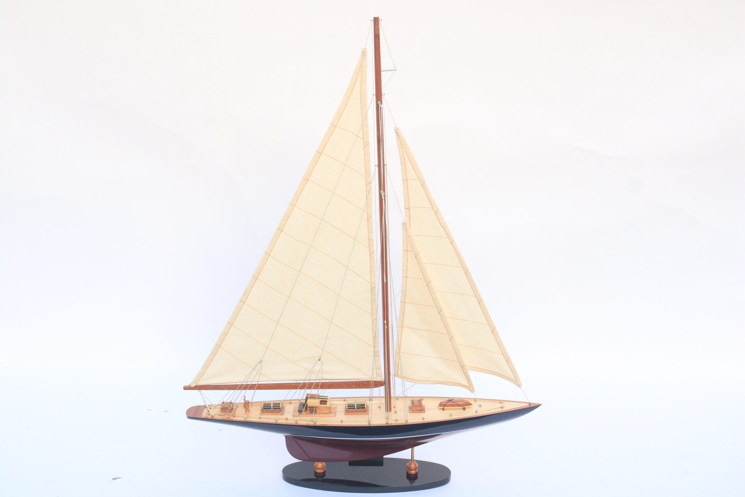 You will receive a box containing this wooden boat, you must raise the mast upon receipt, and then carefully tighten/slide the appropriate lines and linen sails.