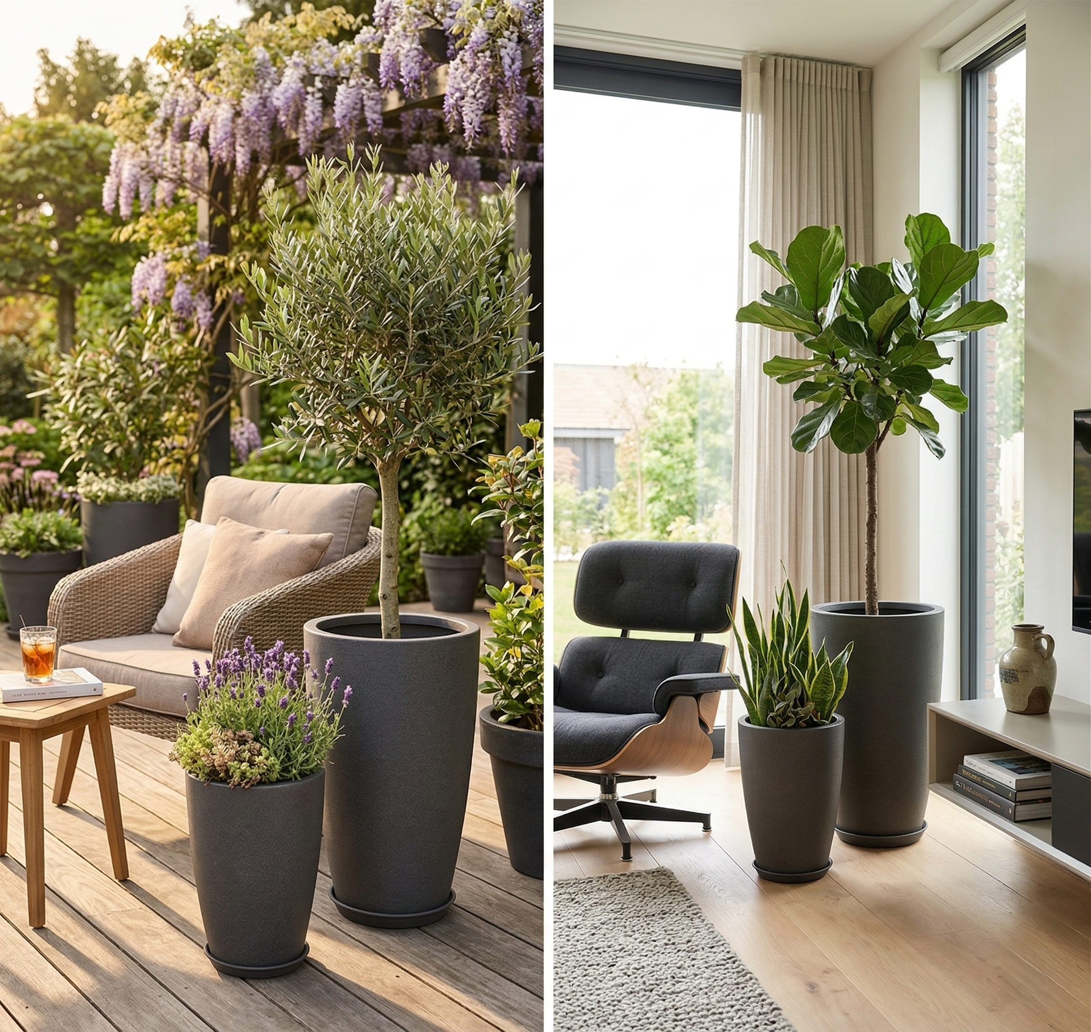 The Odin vase set consists of two stylish, tall planters in the color gray (80cm and 90cm high) that combine beautifully with each other. They are made of UV-resistant and impact-resistant plastic via a rotational molding technique, making them extremely long-lasting and perfect for both indoor and outdoor use. The set comes complete with two handy, matching saucers.