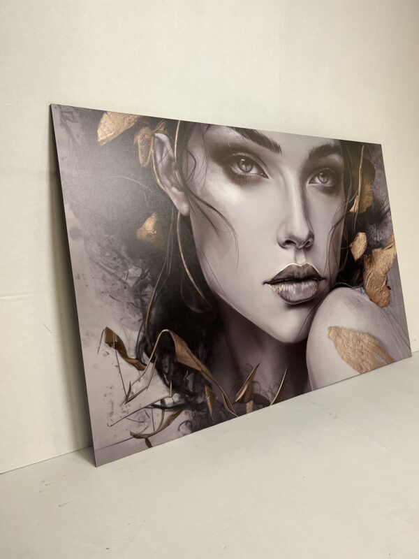 Do you want a beautifully sharp painting depicting a young lady but find glass too shiny? Then this series of paintings is a good alternative. This painting is made from a smooth panel of mdf, on which this image is depicted razor sharp, in a beautiful silk gloss look. You won’t have to deal with reflection with this type of painting. On the back, this painting is reinforced with a 15mm thick mdf frame.