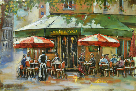 A beautiful 3D Metal painting, with the image of a terrace in a peaceful atmosphere, sublimely made of separate parts of metal, all welded together by hand, to obtain an optimal 3d effect. A beautiful piece of wall decoration for your home, outside under a canopy or in your business. Colors and overall appearance may vary from the photo as this entire item is made by human hands.