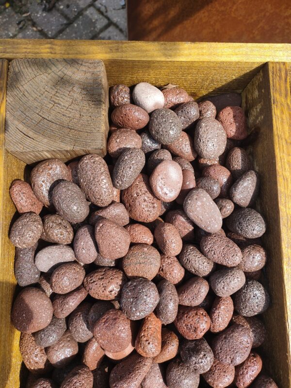 Beautiful coarse round red lava stones in different shades. These particular boulders color beautifully with your paving, paths, memorial or garden ornament, size is 30-50 mm. 3-4 bags of this type of boulders are required per m2. This allows you to convert what you need approximately.