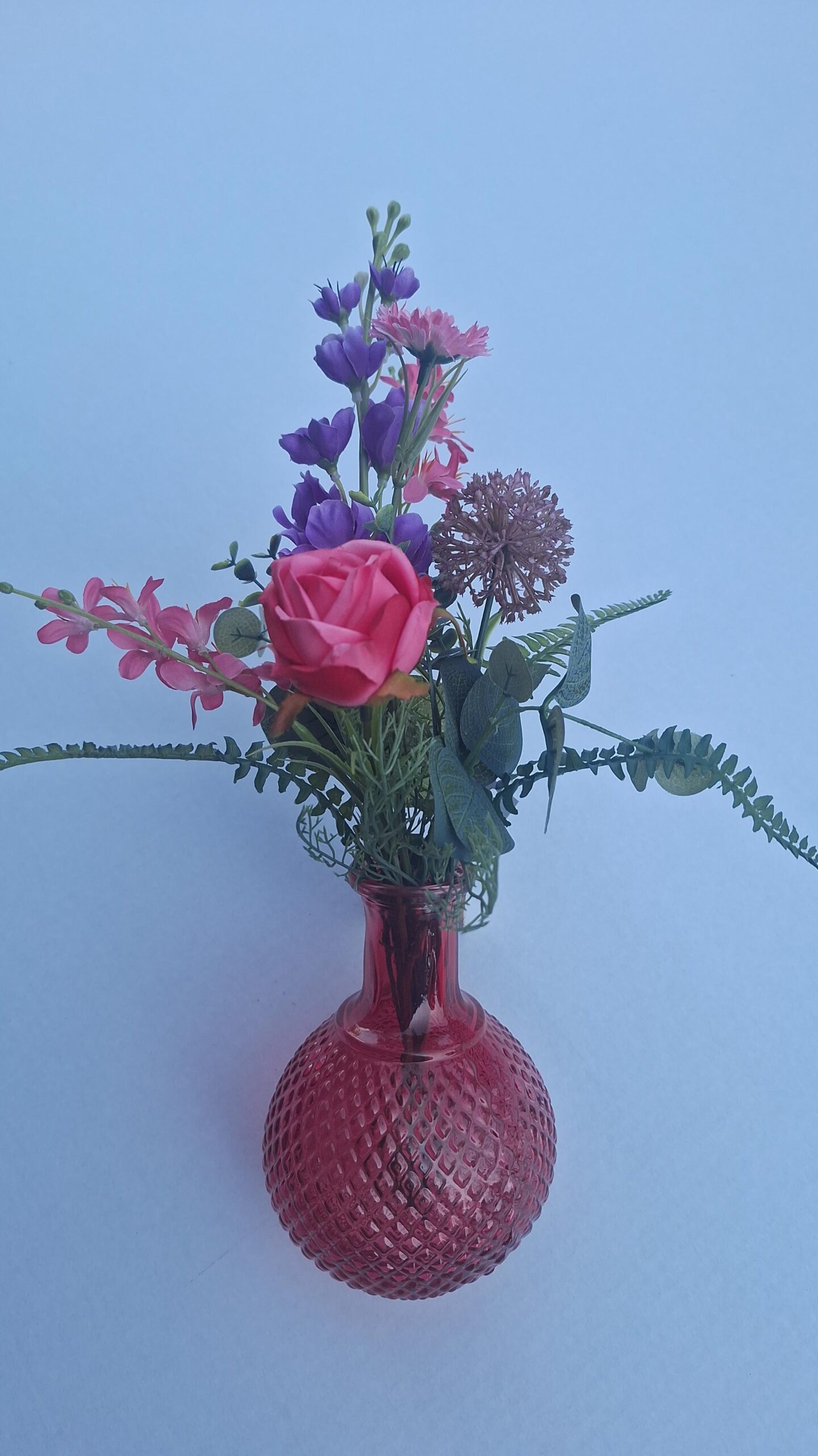 Is this nice, a ready-made silk bouquet in glass vase with mostly fresh red/purple/pink colors. Bouquet is Ca 38cm high and is fixed in a deep pink colored glass vase in size 11x15cm.